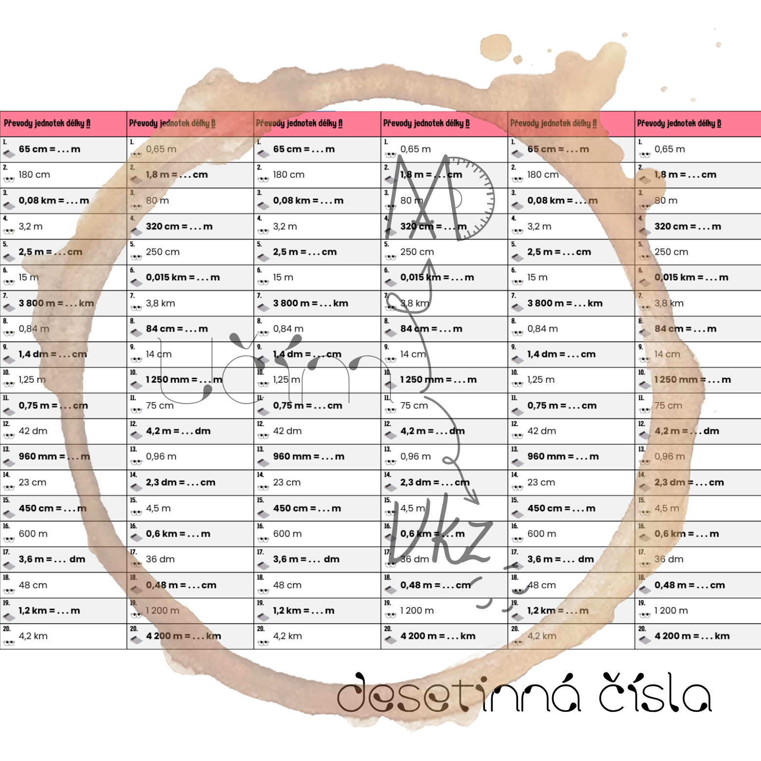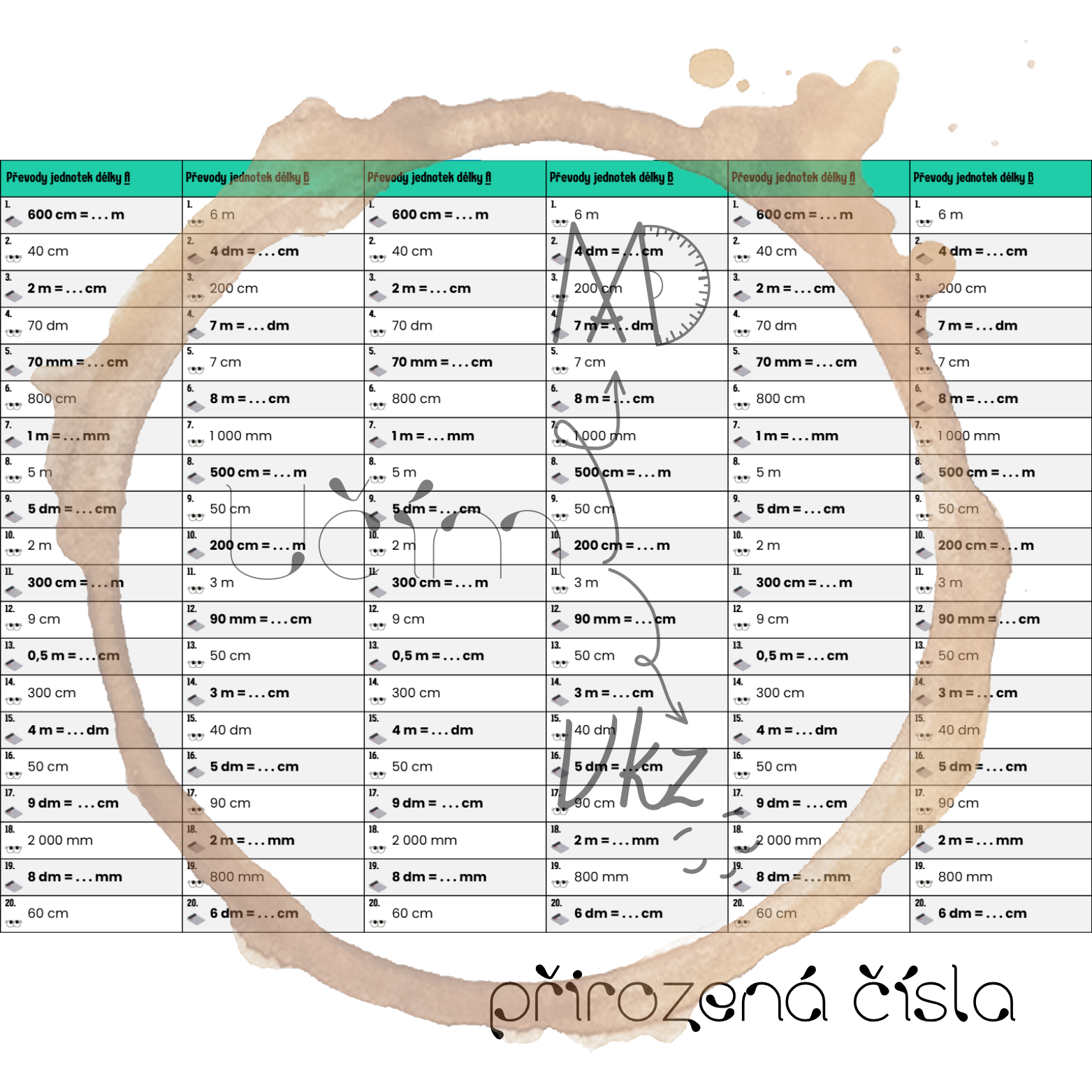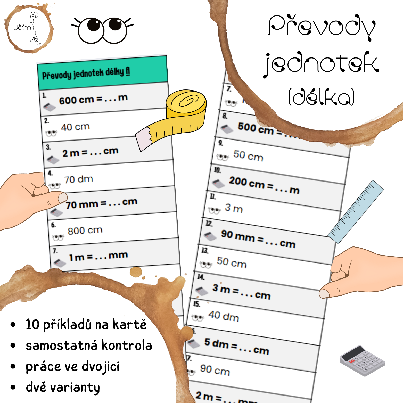 Materiál je primárně pro žáky 2. stupně ZŠ a slouží k opakování převodů jednotek délky. Na každé kartě je 10 příkladů a 10 výsledků. Jsou k dispozici dvě varianty s přirozenými čísly a s desetinnými čísly.