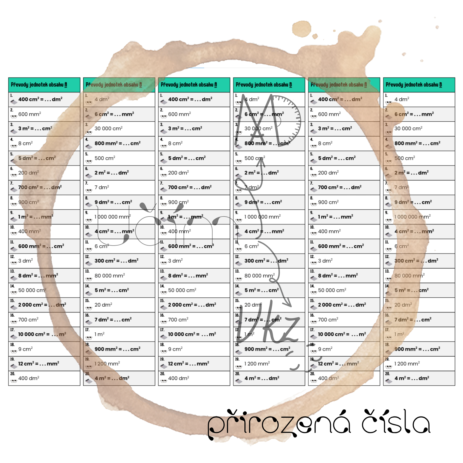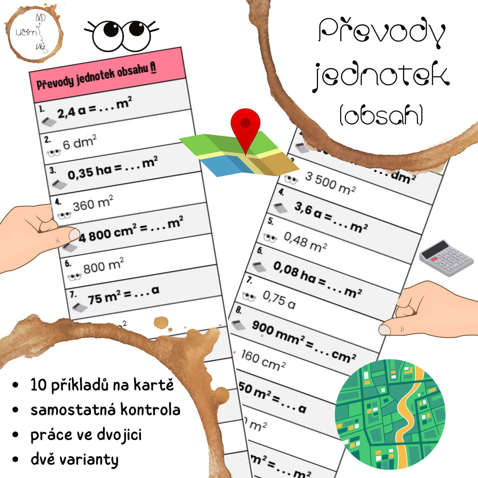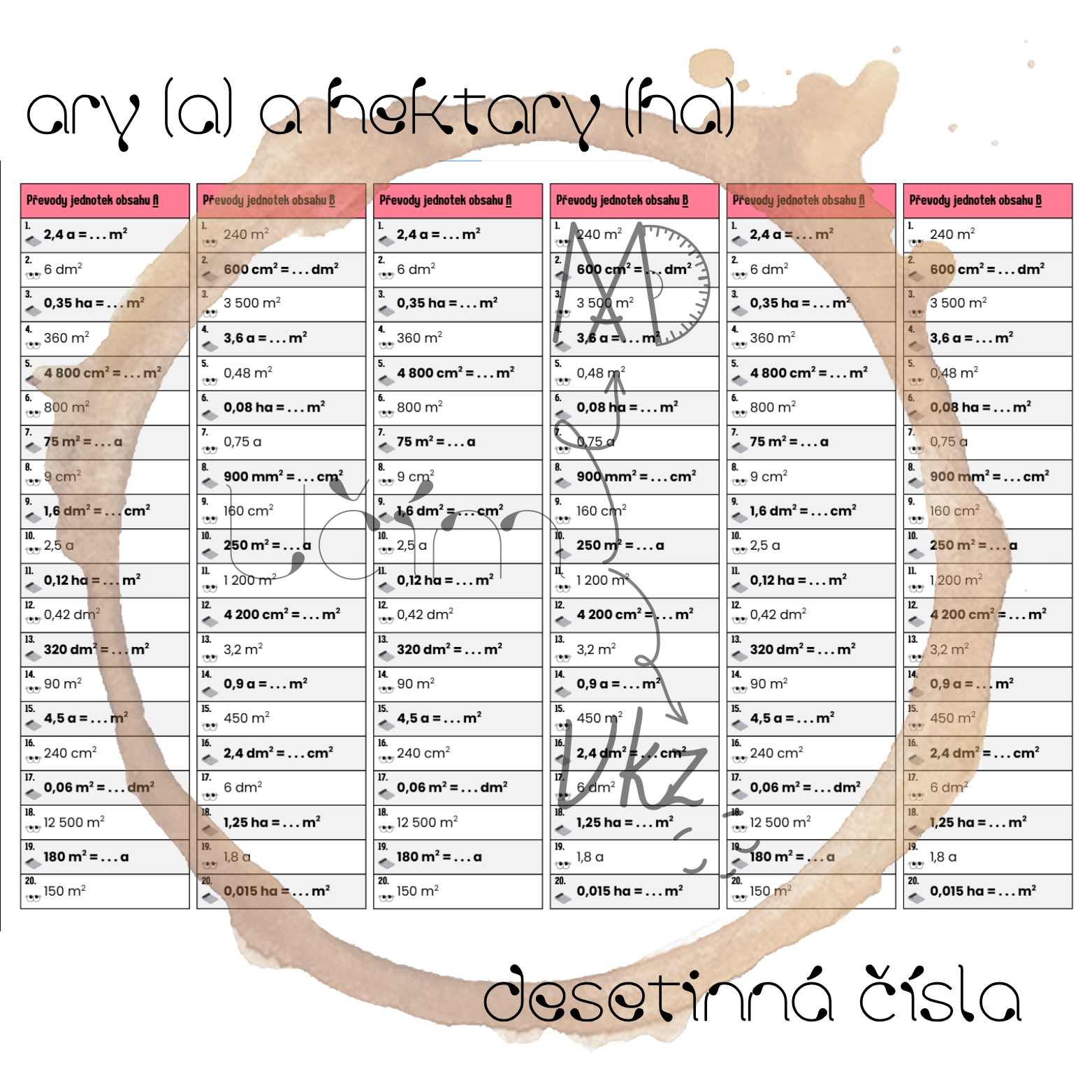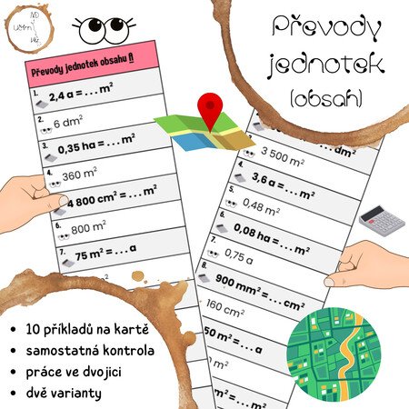 Materiál je primárně pro žáky 2. stupně ZŠ a slouží k opakování převodů jednotek obsahu. Na každé kartě je 10 příkladů a 10 výsledků. Jsou k dispozici dvě varianty s přirozenými čísly a s desetinnými čísly + jednotky ary a hektary.