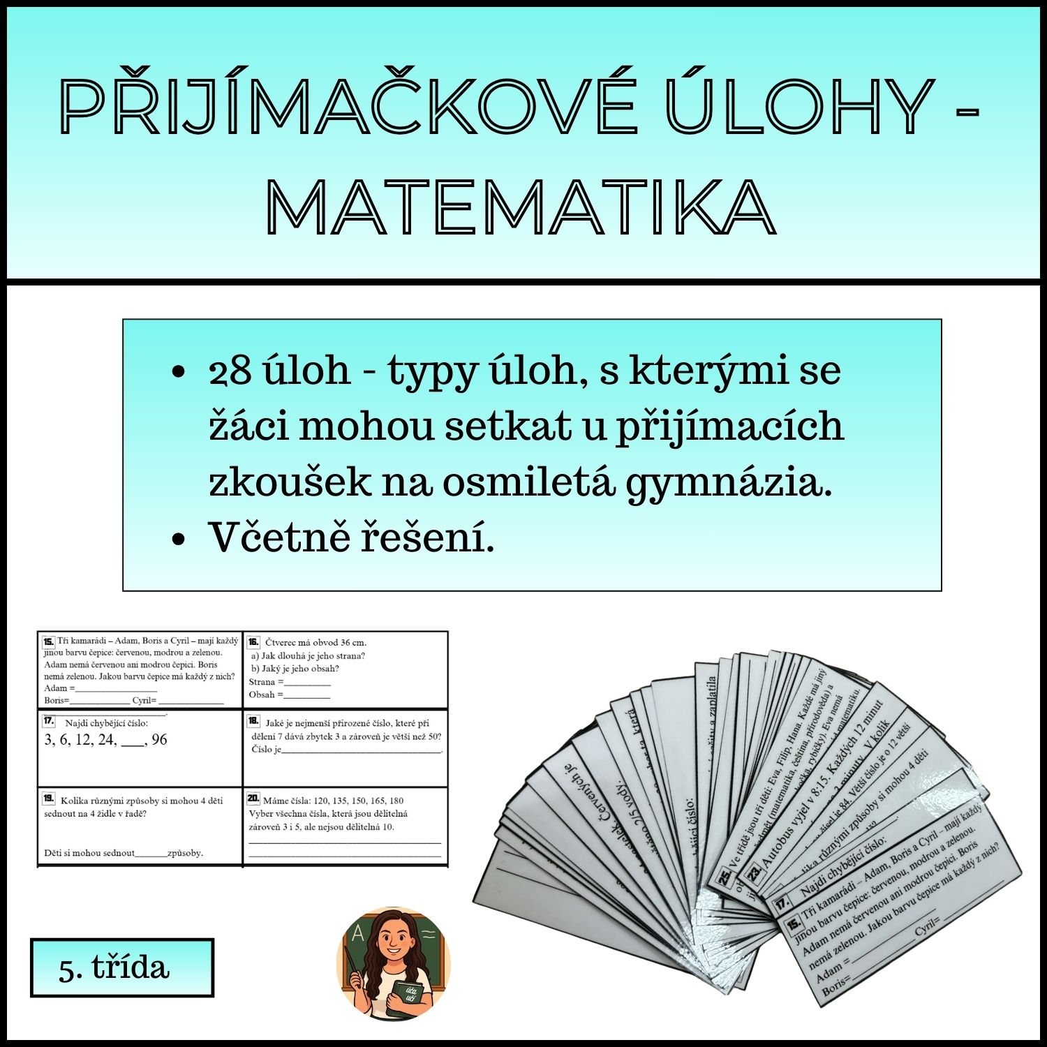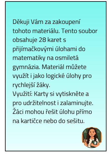 Tento soubor obsahuje 28 karet s přijímačkovými úlohami do matematiky na osmiletá gymnázia. Materiál můžete využít i jako logické úlohy pro rychlejší žáky.