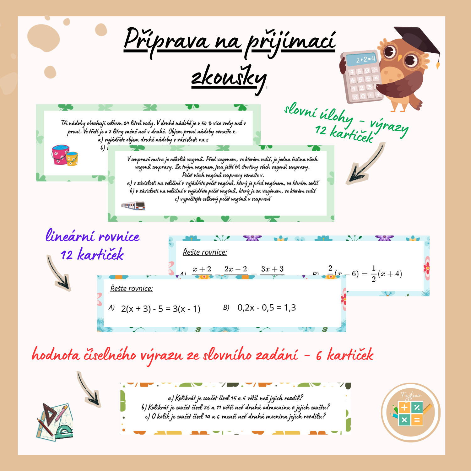 a) řešení slovních úloh - žáci zapíší vztahy mezi veličinami pomocí výrazu, sestaví rovnici a vypočítají konkrétní hodnotu neznámé (str. 3 až 8 - oboustranně 3 a 4, 5 a 6, 7 a 8)