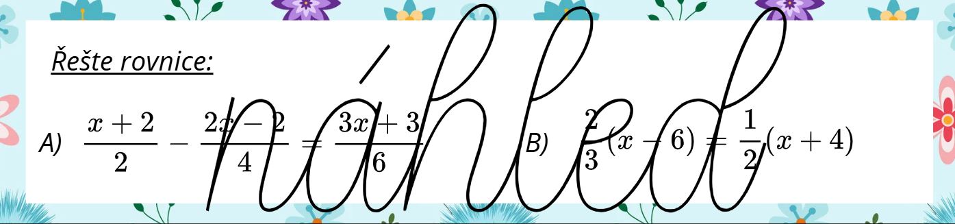 b) řešení lineárních rovnic - se závorkou nebo zlomky (vyskytují se rovnice s konkrétním číselným výsledkem, rovnice, která nemají řešení nebo mají nekonečně mnoho řešení) - str. 9 až 12 (oboustranně 9 a 10, 11 a 12)