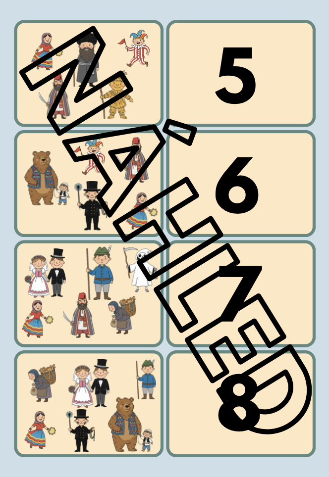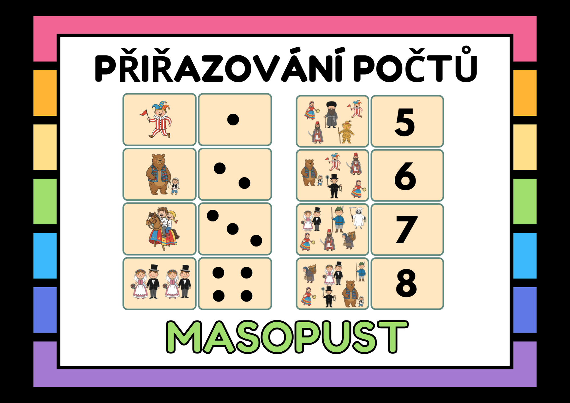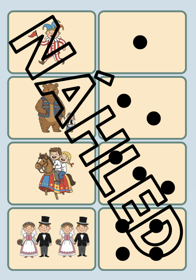 Děti mají za úkol přiřadit masopustní postavy ke správnému počtu teček či k číslici. Hra upevňuje poznávání čísel, počítání a porovnávání množství.