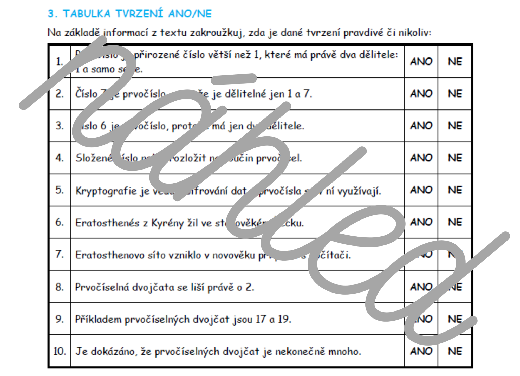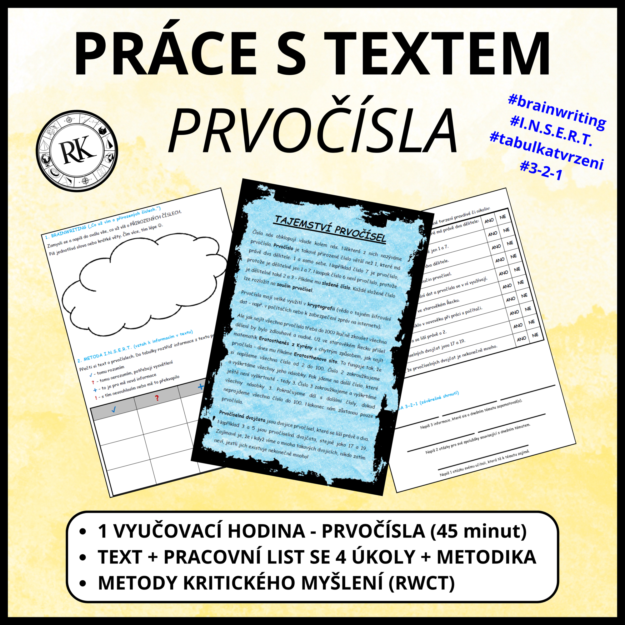 Jedná se o vzdělávací materiál pro výuku matematiky na 2. stupni ZŠ, který rozvíjí kompetence k učení formou metod kritického myšlení a práce s textem. Žáci si během aktivity uvědomí, jaké znalosti o přirozených číslech již mají a rozšíří si je o nové pojmy – prvočíslo, složené číslo, Eratosthenovo síto, prvočíselná dvojčata ...