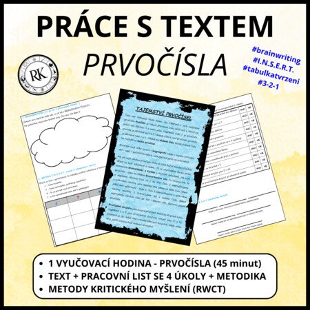 Vzdělávací materiál slouží jako úvodní hodina k tématu „Prvočísla a čísla složená“. Součástí souboru je výchozí text, pracovní list na práci s textem a podrobná metodika.