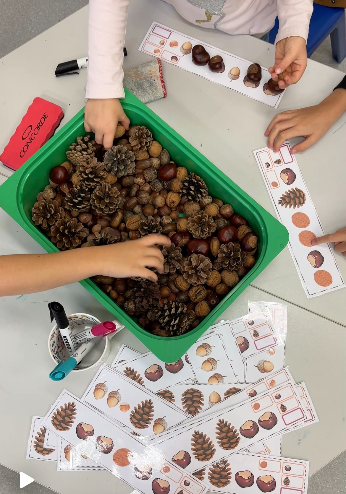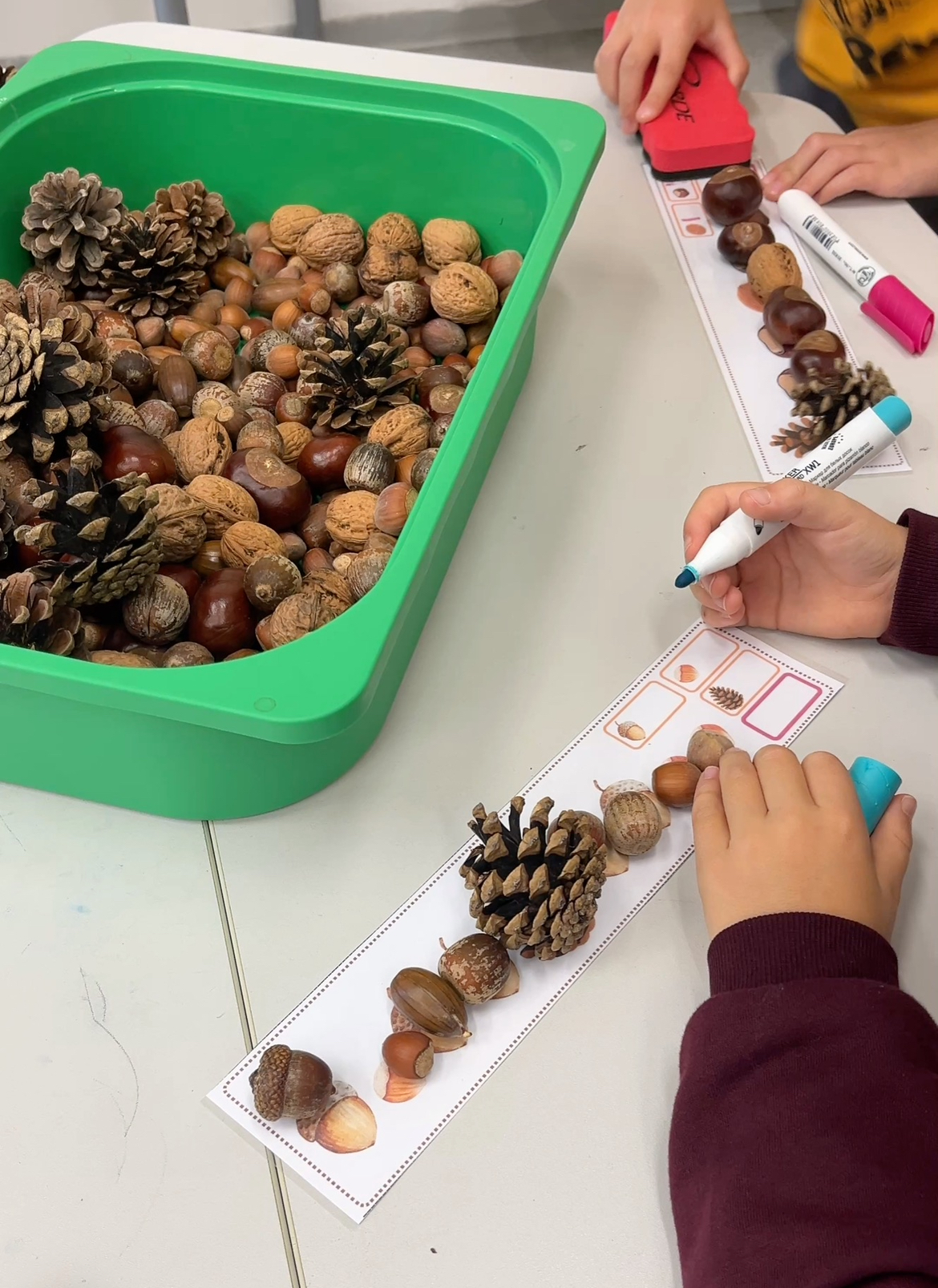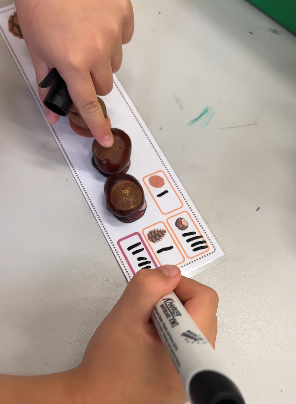 Hravá podzimní aktivita pro prvňáčky. Skládání řad podle vzoru, názorné počítání prvků (zápis čárkami nebo číslovkou) a praktické sčítání. Lze využít i před vyvozením číslovek.