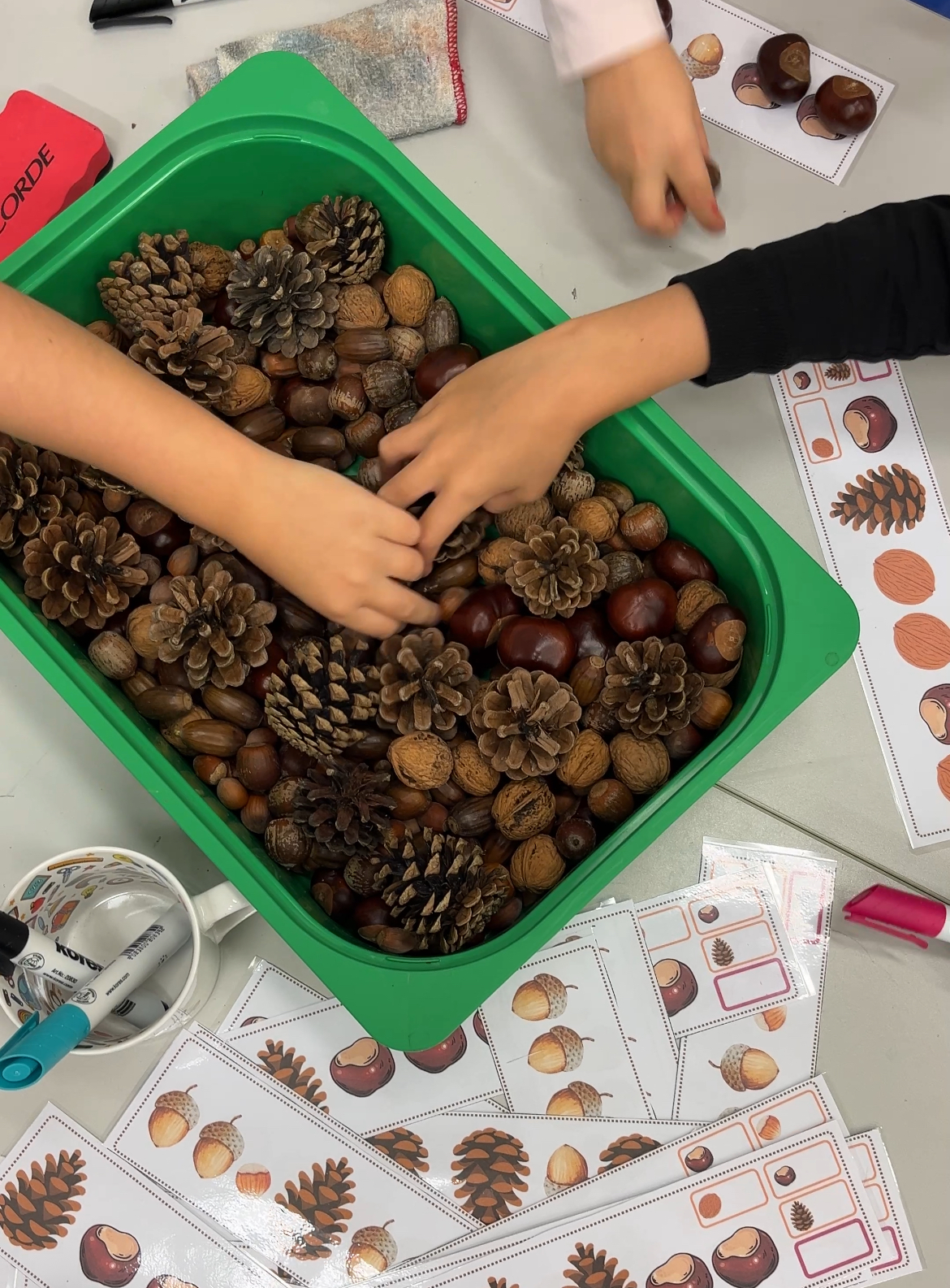 K práci s materiálem je třeba nasbírat přírodniny: kaštany, žaludy, šišky, vlašské ořechy a lískové oříšky.