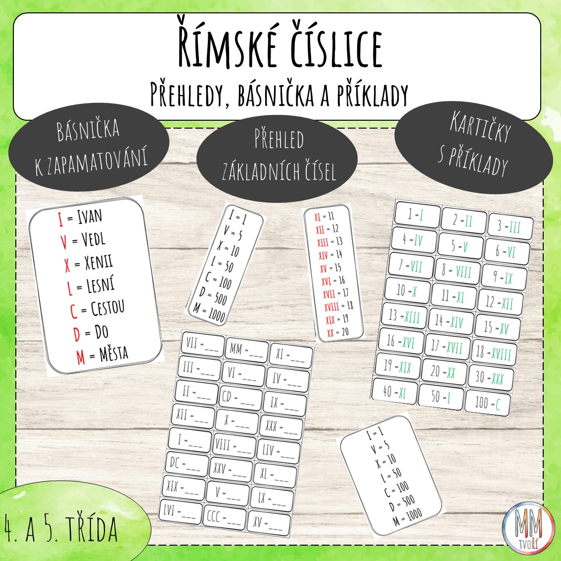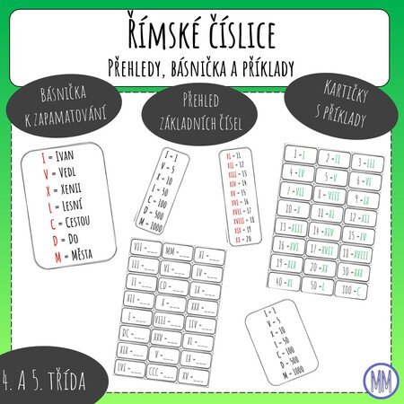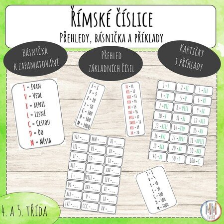 Materiál obsahuje básničku k zapamatování po sobě jdoucích římských čísel, přehled základních čísel a příklady k převodu římských čísel na arabské a opačně - s řešením. Přehledové tabulky jsou určené jako pomůcka k lepšímu zapamatování. Kartičky s příklady doporučuji zalaminovat a nastříhat a používat spolu s (mazacím) fixem na tabulku. Děti mohou provádět samokontrolu. Přehledové tabulky jsou v několika verzích.