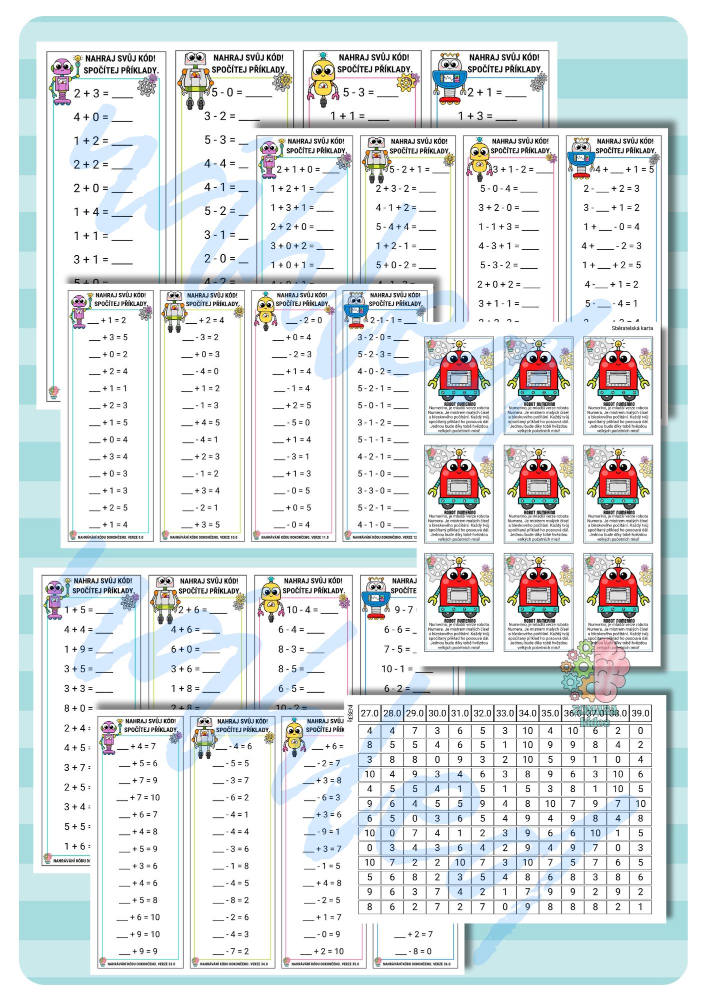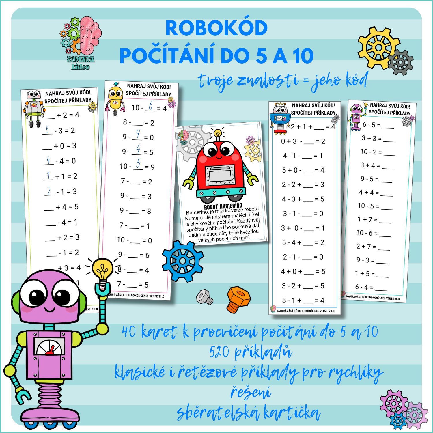 Procvičte sčítání a odčítání v oboru do 5 a 10. S ROBOKÓDEM je počítání zábavné a s jasnou motivací. Sběratelskou kartou je tentokrát robot Numeríno, mistr malých čísel a bleskového počítání. Celkem 520 příkladů na 40 kartách. Vhodné i k laminaci.