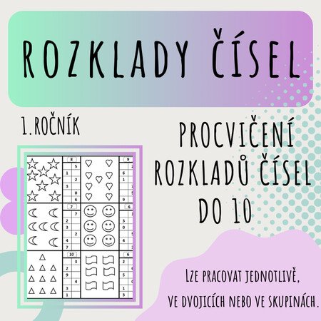 Materiál obsahuje kartičky, na kterých si děti procvičují rozklady čísel do 10. Slouží jako zábavné procvičování matematiky.