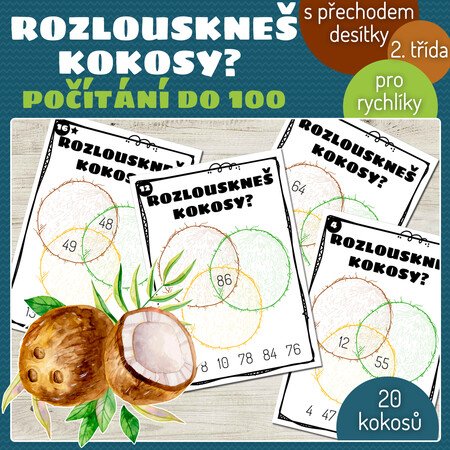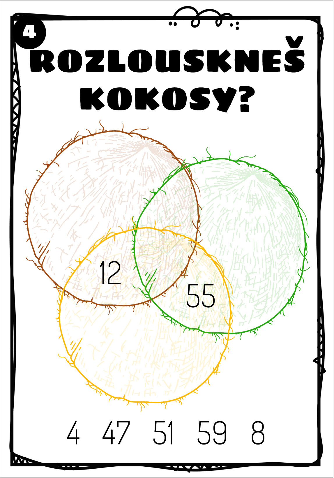 Materiál obsahuje 20 různých kartiček. Úkolem žáků je umístit čísla pod obrázkem na správná místa v kokosech (Vennovy diagramy). Nebudou-li si vědět rady, můžeme jim napovědět, že uprostřed je největší číslo. Kartičky 16-20 obsahují náročnější příklady na počítání.