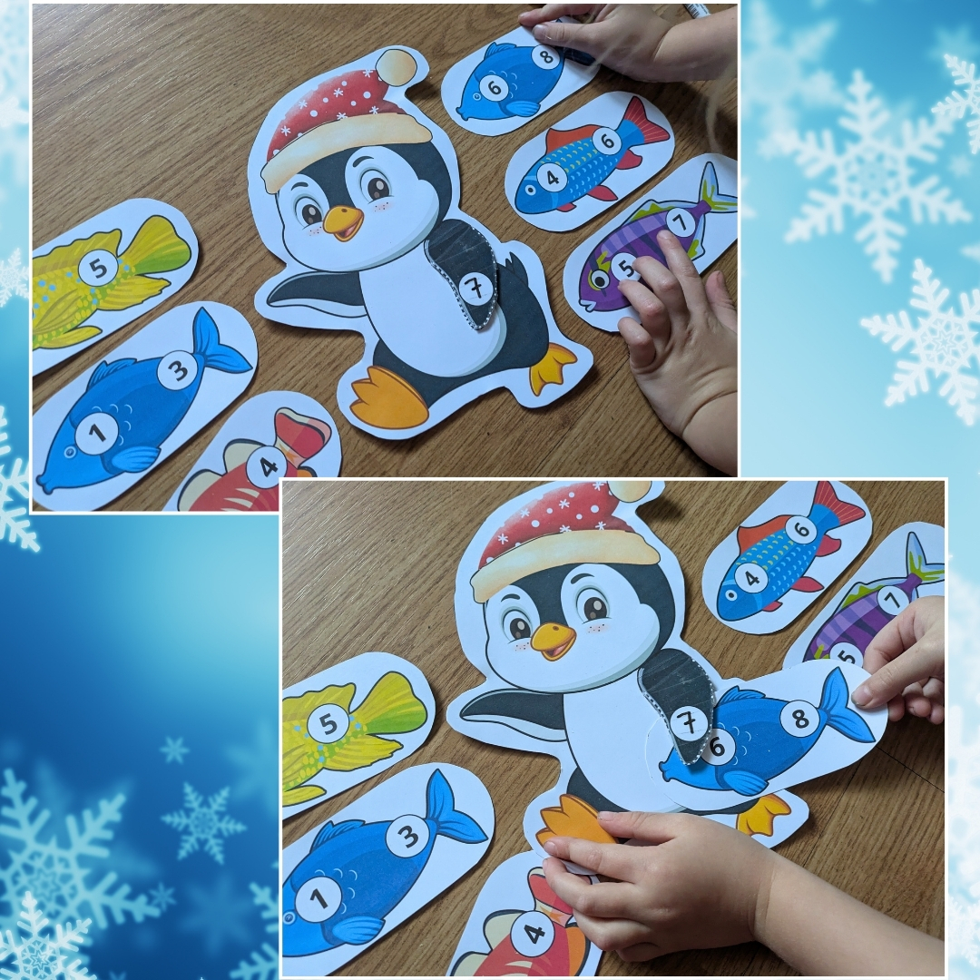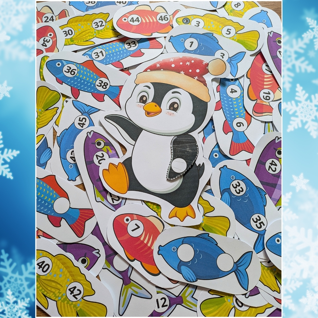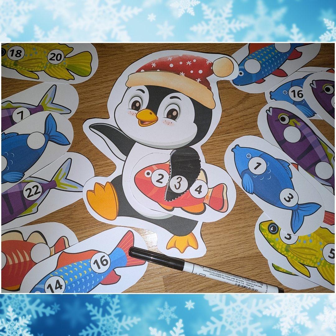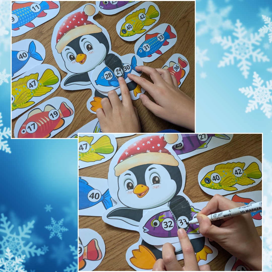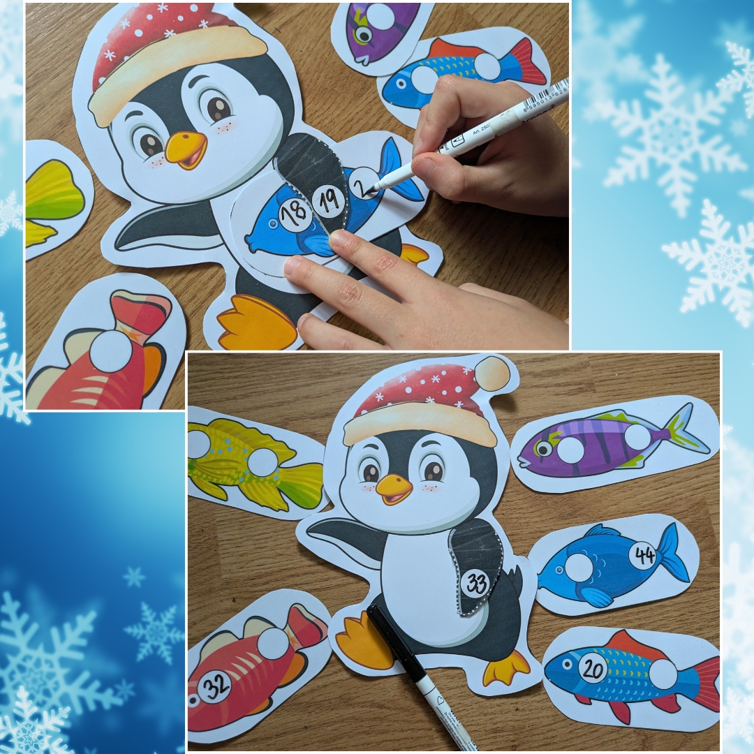 🐧Vložte tučňákovi pod křídlo vámi vybranou rybu a chybějící prostřední číslo musí dopsat děti...