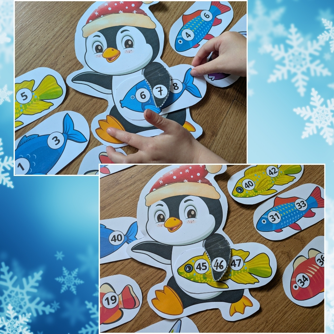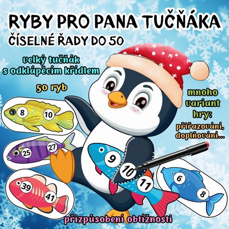 🐧Napište tučňákovi na křídlo nějaké číslo a děti hledají rybu s takovými čísly, aby vznikla číselná řada.