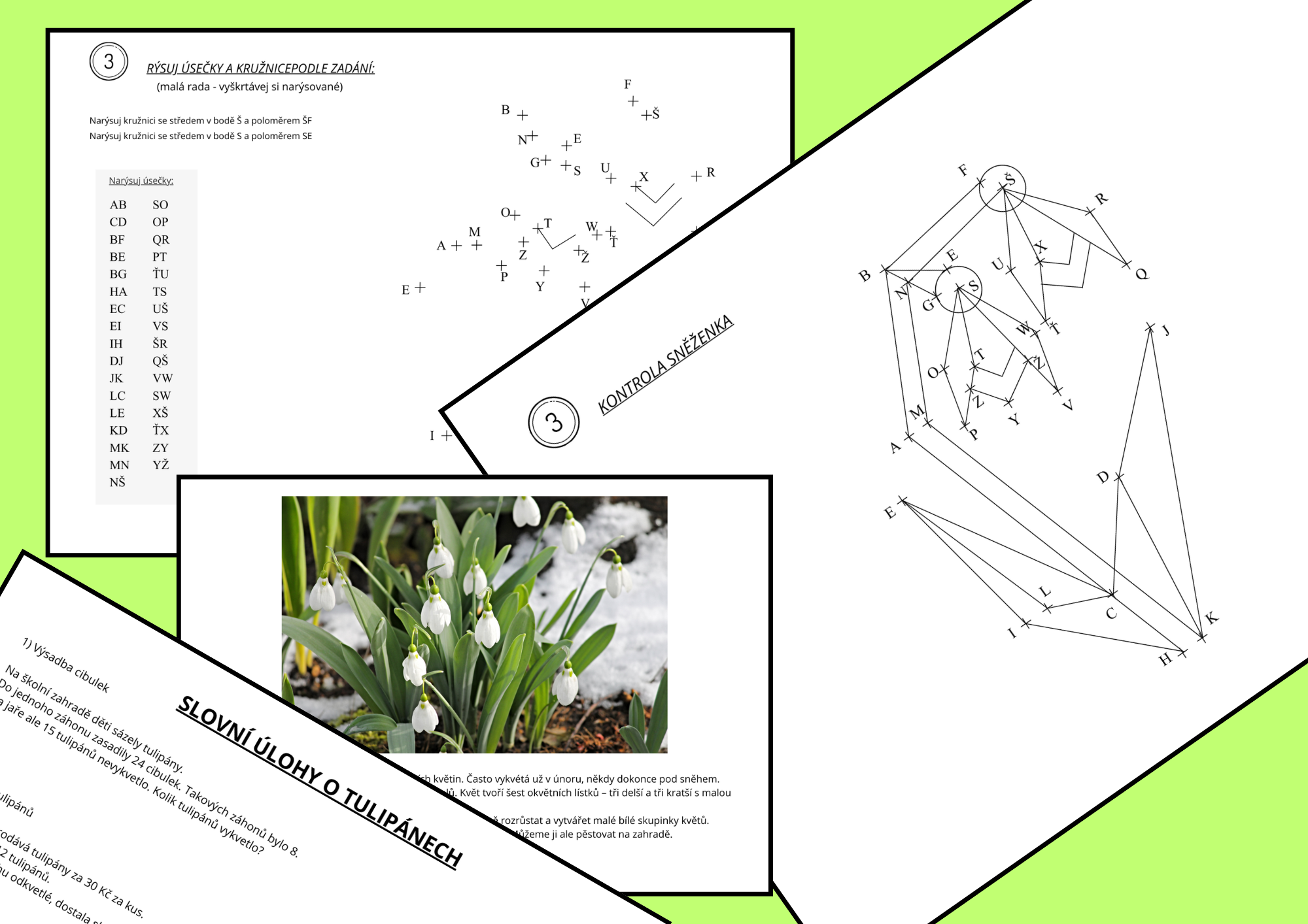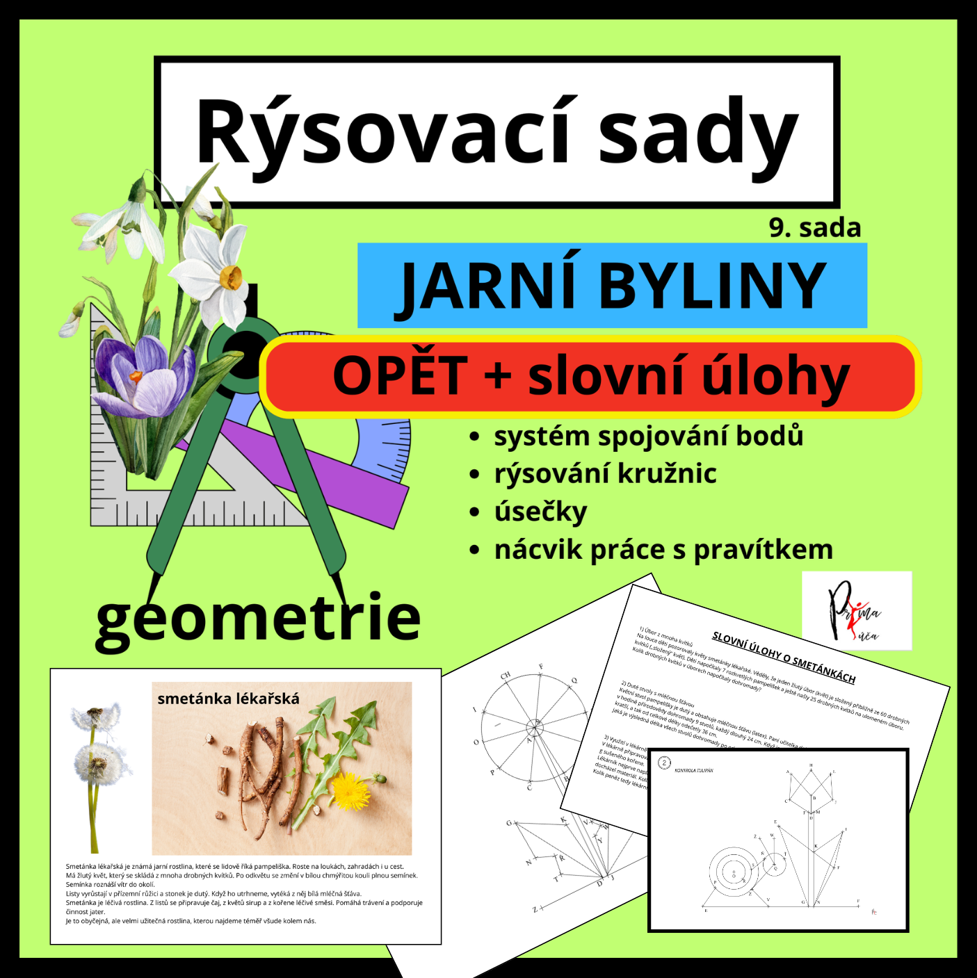 na přání mnohých z vás jsem vytvořila další sadu na procvičování rýsování úseček a kružnic. Tentokrát tedy téma - první jarní byliny. Opět jsem do materiálu přidala ke každé bylině 3 slovní úlohy včetně řešení. Opět nechybí ani fotografie reálných bylin se stručným popisem.