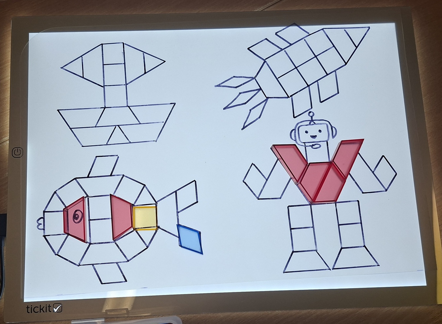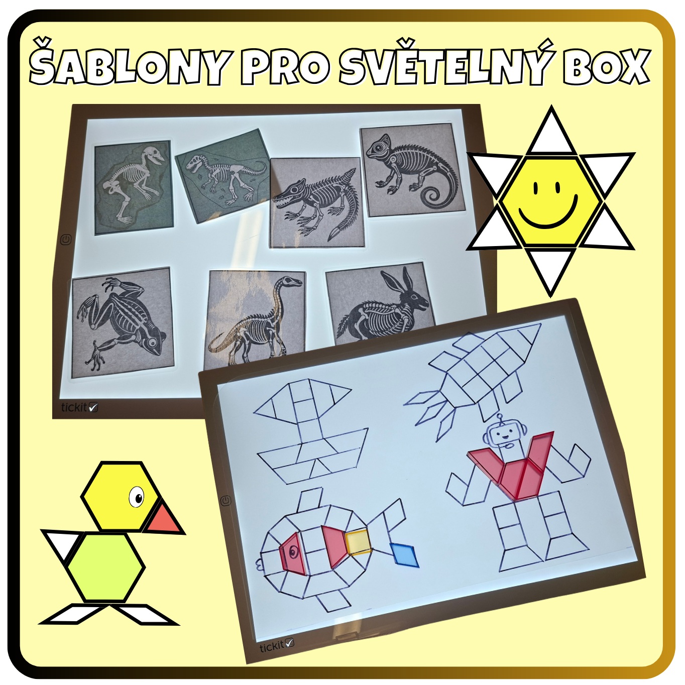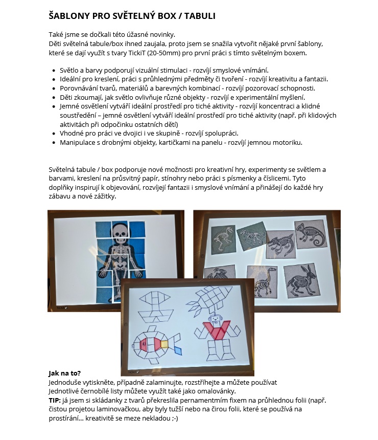 Děti světelná tabule/box ihned zaujala, proto jsem se snažila vytvořit nějaké první šablony, které se dají využít s tvary (20-50mm) pro první práci s tímto světelným boxem.