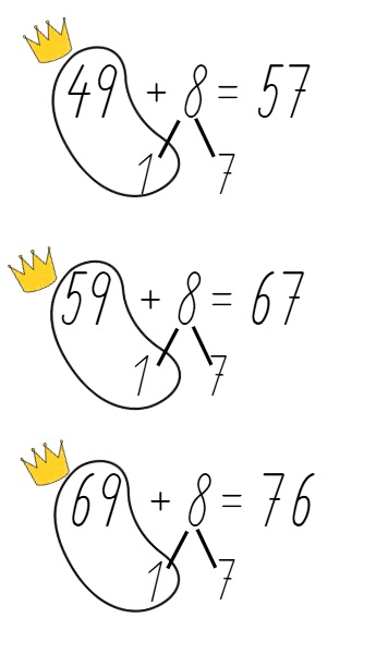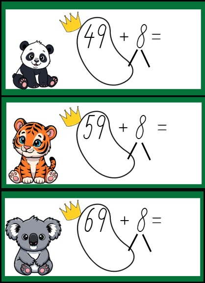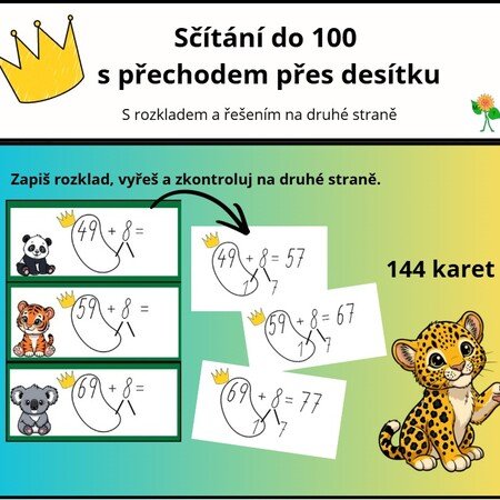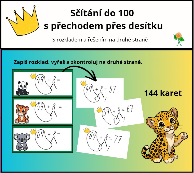 Soubor obsahuje celkem 144 karet určených k vyvození sčítání do 100 s přechodem přes základ deset. Děti počítají podobně jako při vyvození sčítání do 20, kdy hledají “královničku desítku”, pomocí které si usnadní sčítání. Z druhé strany je přiloženo řešení pro rychlou kontrolu. Tyto karty jsou určeny pro vyvození nebo jako pomůcka pro děti se SPU nebo pro děti, které potřebují delší čas k osvojení učiva.