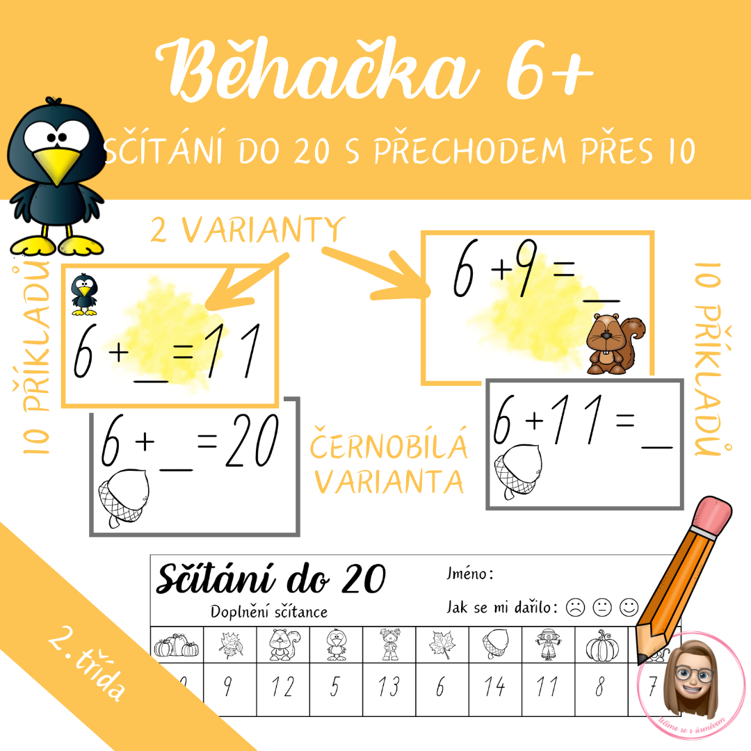 Hravé procvičování sčítání s přechodem přes 10. Děti počítají pouze příklady typu 6+, běhají po třídě, zapisují výsledky a učí se s radostí. Ideální pro 1.–2. třídu