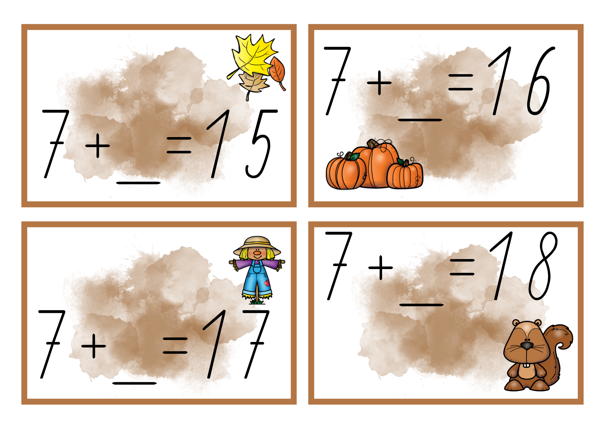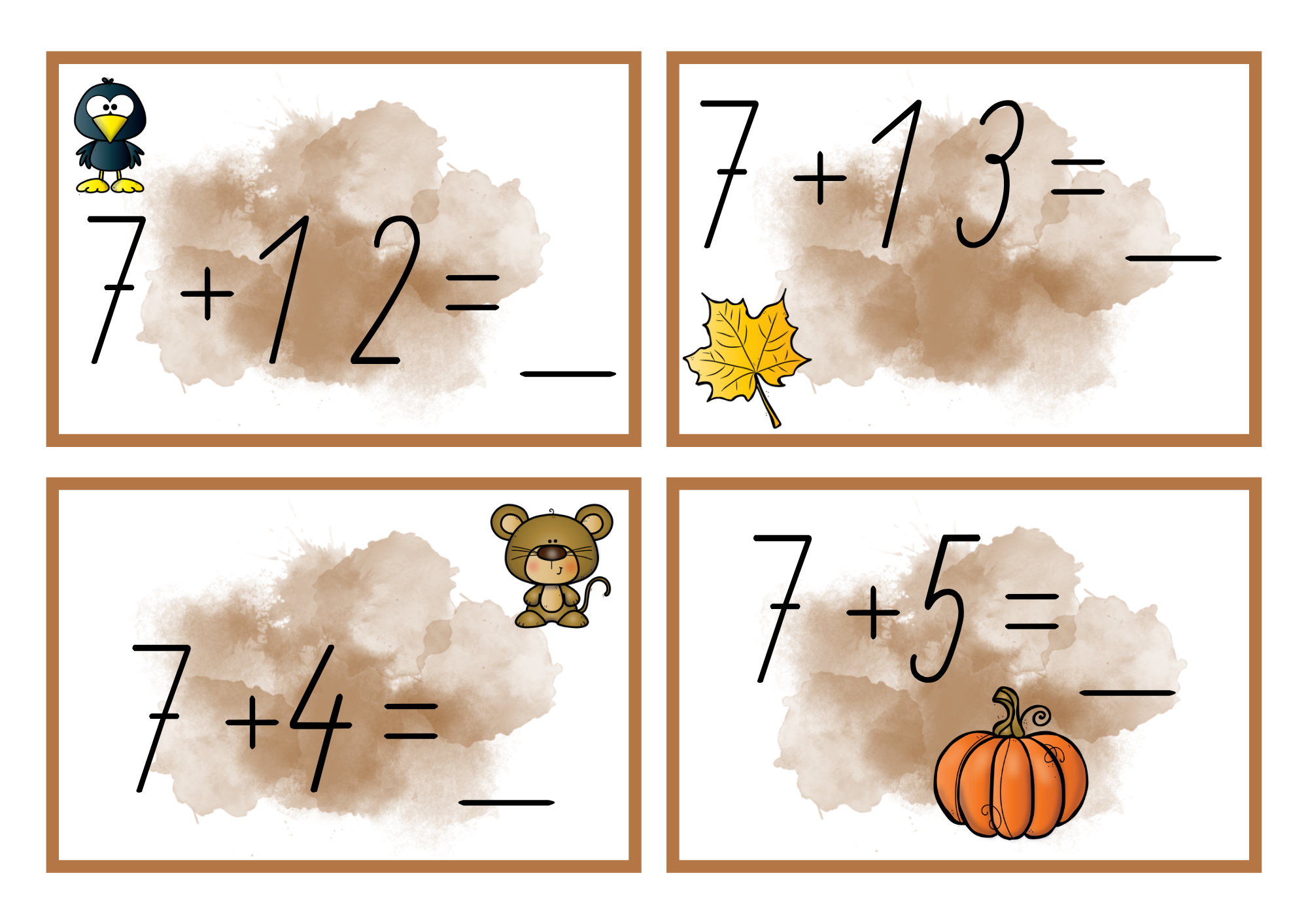 Rozmístěte kartičky po třídě nebo chodbě. Děti je hledají, počítají příklady a zapisují správné odpovědi do záznamového archu podle symbolu na kartičce. Lze zvolit i náročnější variantu – zapamatovat si příklad a výsledek zapsat až u lavice.