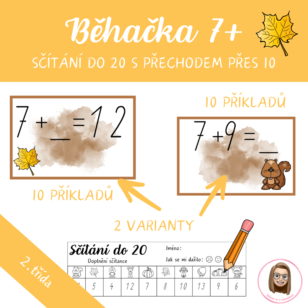 Zábavná běhačka pro prvňáky a druháky, díky které si děti procvičí sčítání s přechodem přes desítku (typ 7+) hravou a pohybovou formou.