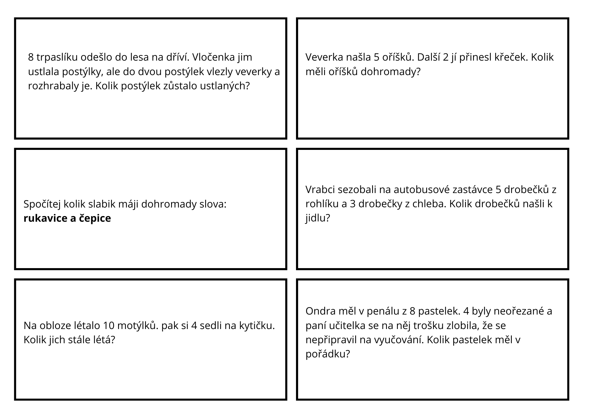 Práce s materiálem je založena na aktivním zapojení dětí. Žáci si vylosují kartičku s textem slovní úlohy, úlohu si přečtou a snaží se porozumět jejímu obsahu. Následně vyhledávají mezi obrázky ten, který podle nich k danému textu patří, a přiřazují ho k úloze. Tímto krokem se ověřuje, zda dítě skutečně porozumělo textu, neřeší úlohu mechanicky a dokáže propojit slovní popis se situací na obrázku. Teprve poté žáci úlohu samostatně nebo ve dvojici řeší.