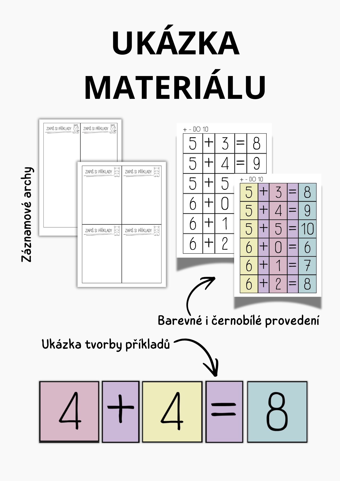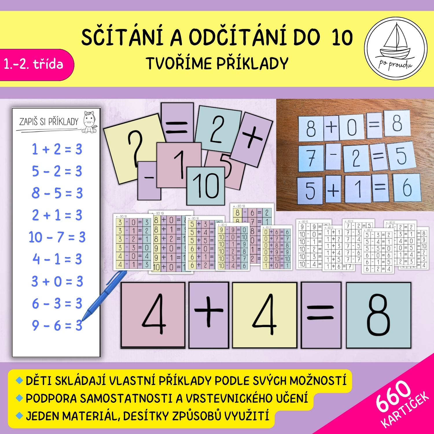 Tento materiál nabízí otevřený a vysoce univerzální způsob práce se sčítáním a odčítáním do 10. Děti si samostatně skládají vlastní příklady, manipulují s kartičkami a pracují v tempu, které odpovídá jejich možnostem. 💡