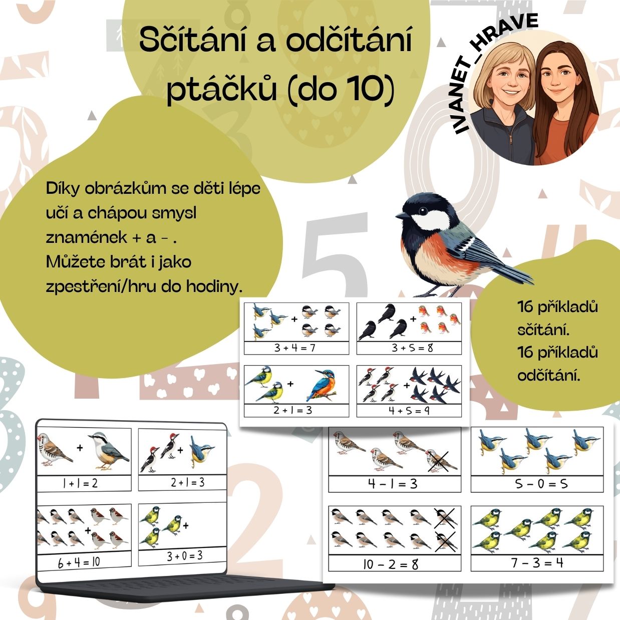 16 jednoduchých příkladů na sčítání a 16 příkladů na odčítání.