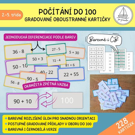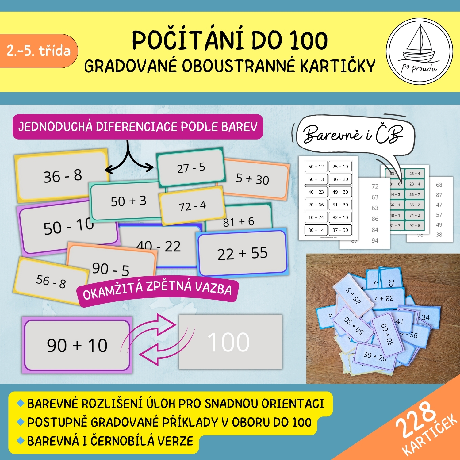 Tento materiál nabízí 228 gradovaných oboustranných kartiček pro procvičování sčítání a odčítání v oboru do 100. 💡
