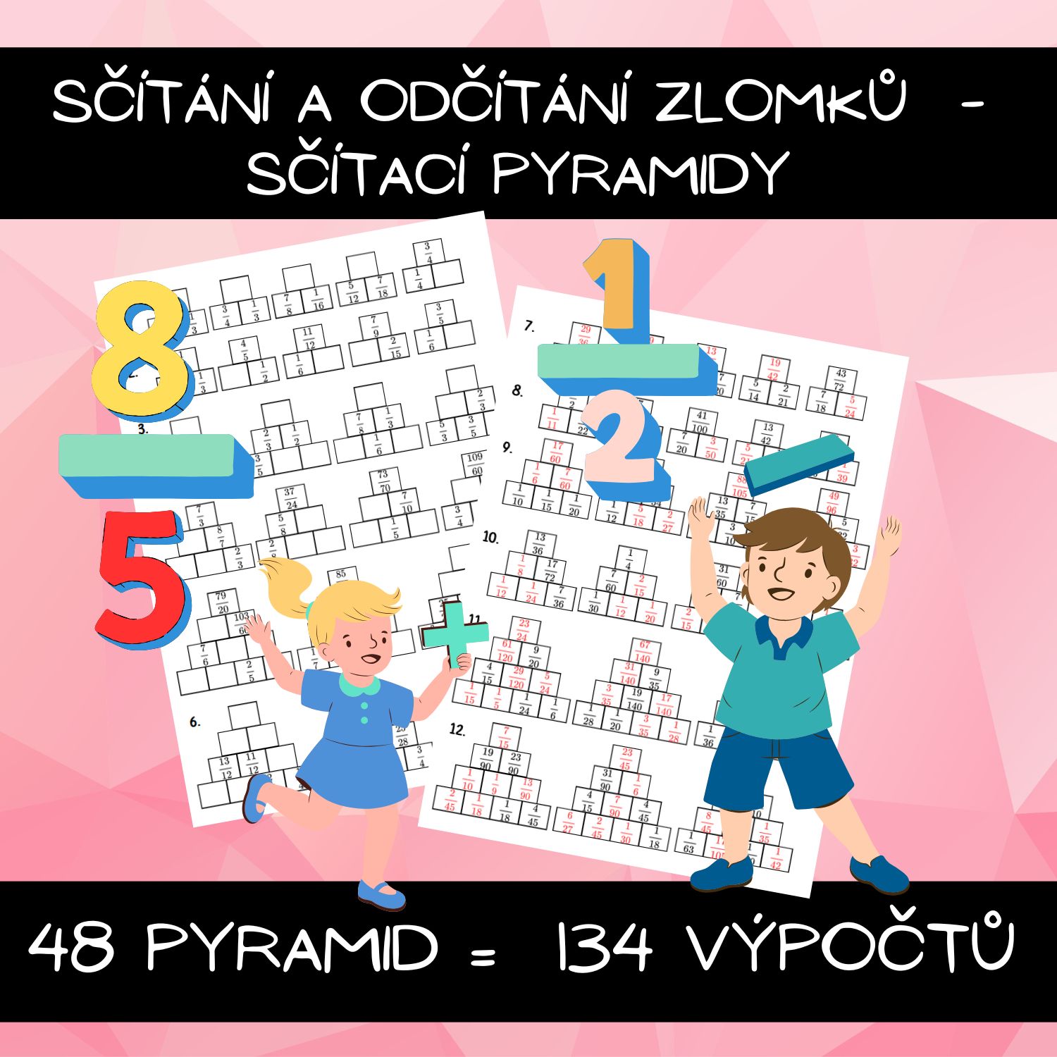 Materiál obsahuje 48 sčítacích pyramid pro procvičení sčítání a odčítání zlomků: úlohy se 2, 3 i 4 řádky, celkem 134 výpočtů. Součástí jsou dvě strany zadání v různých variantách.
