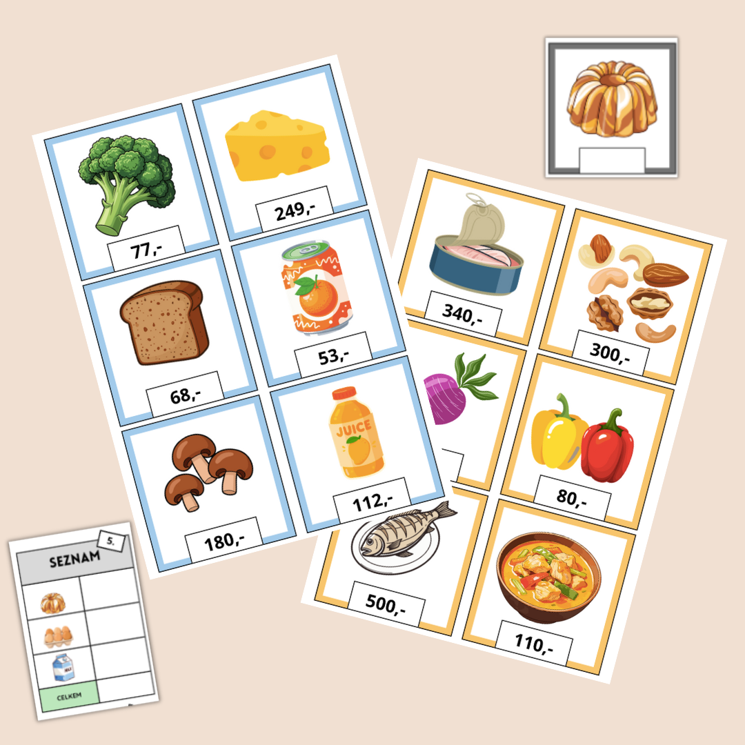 - Zboží s prázdnými políčky pro vepsání vlastních čísel (ceny), můžete sem napsat například násobilku (3·5...), desetinná čísla nebo čísla na počítání do stovky.