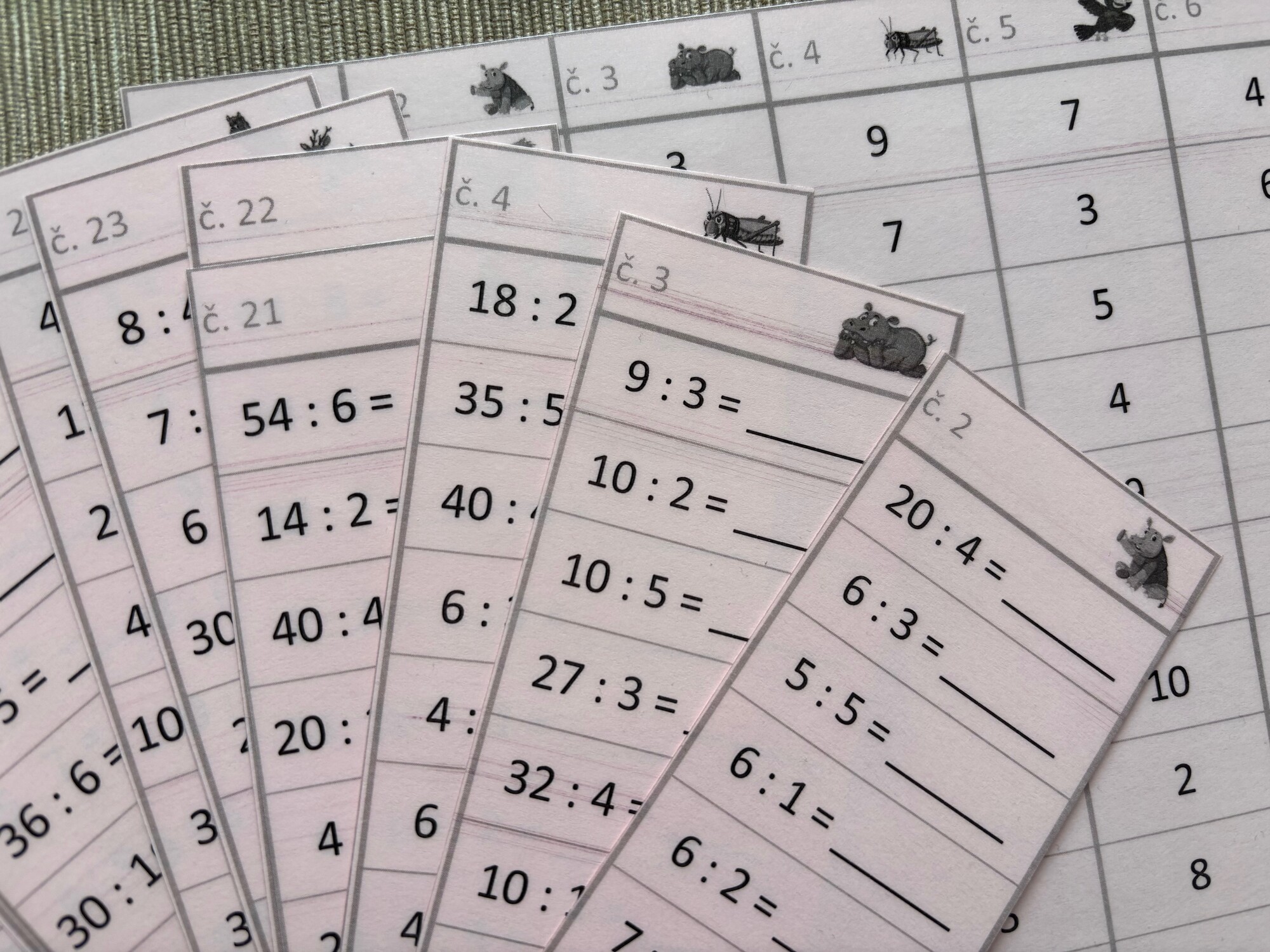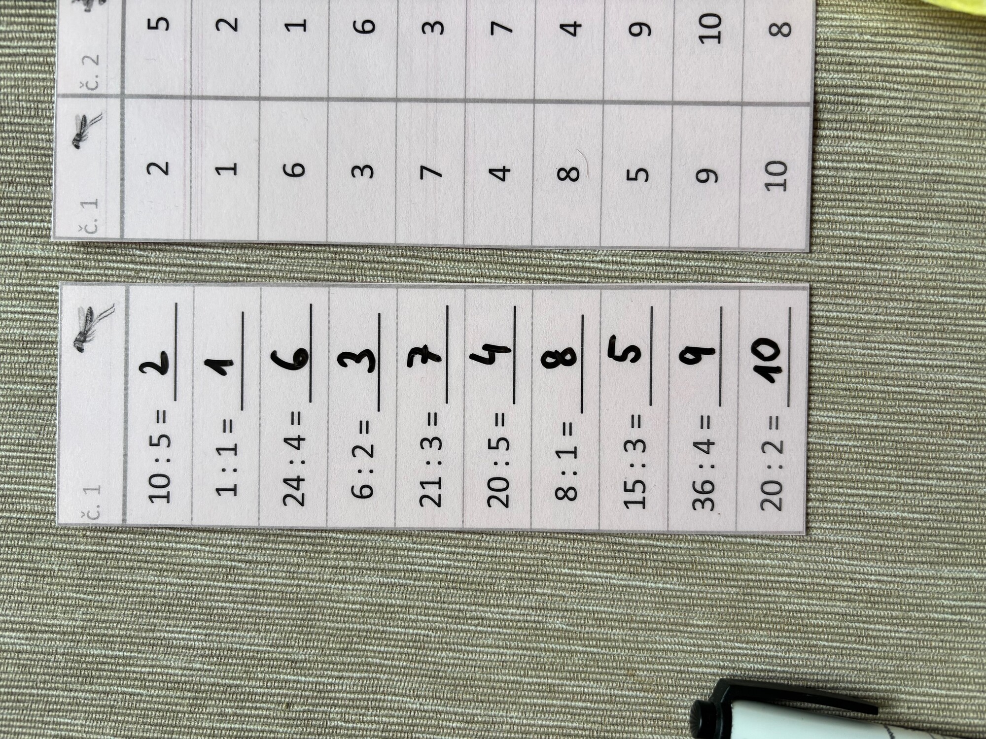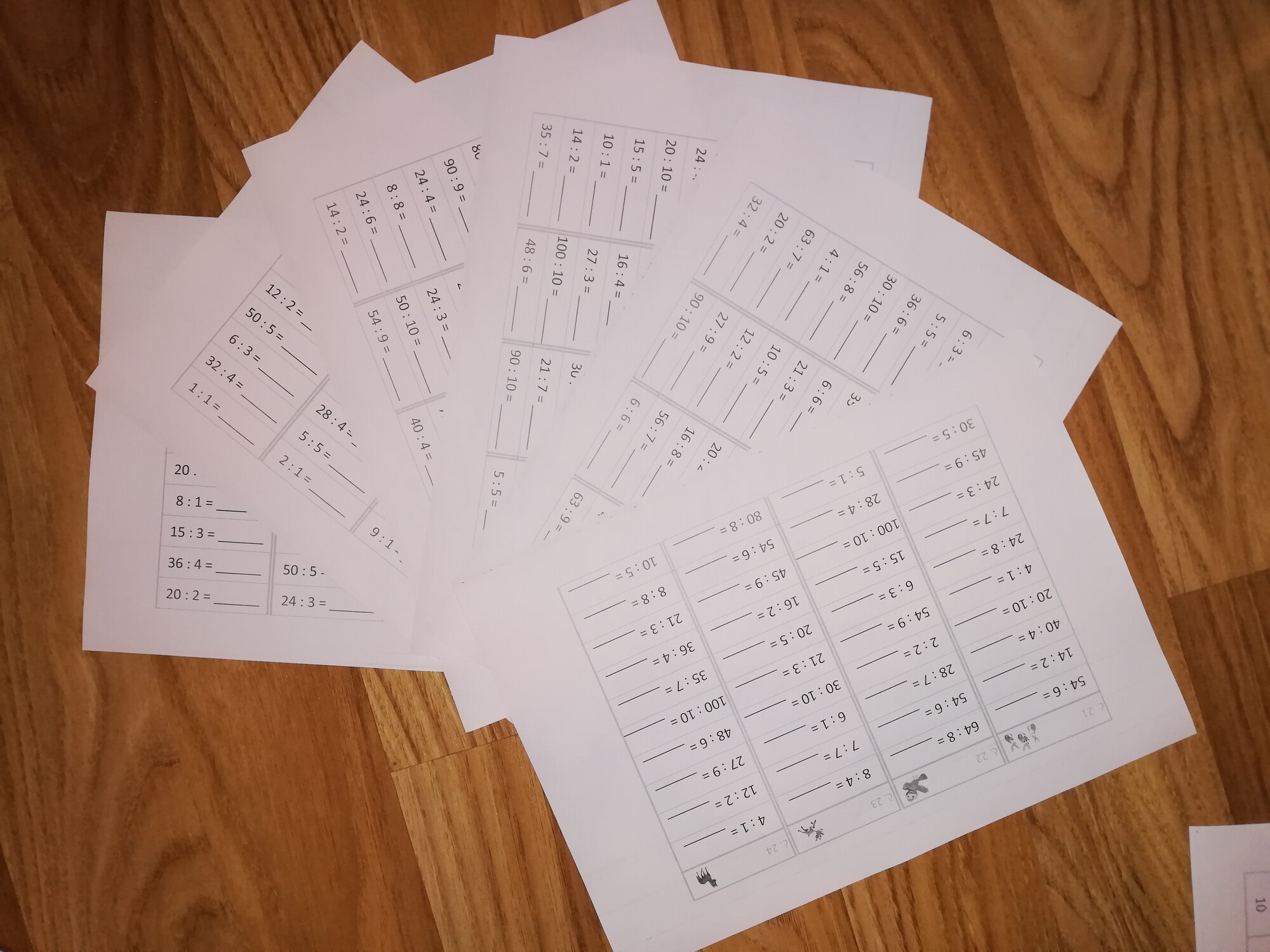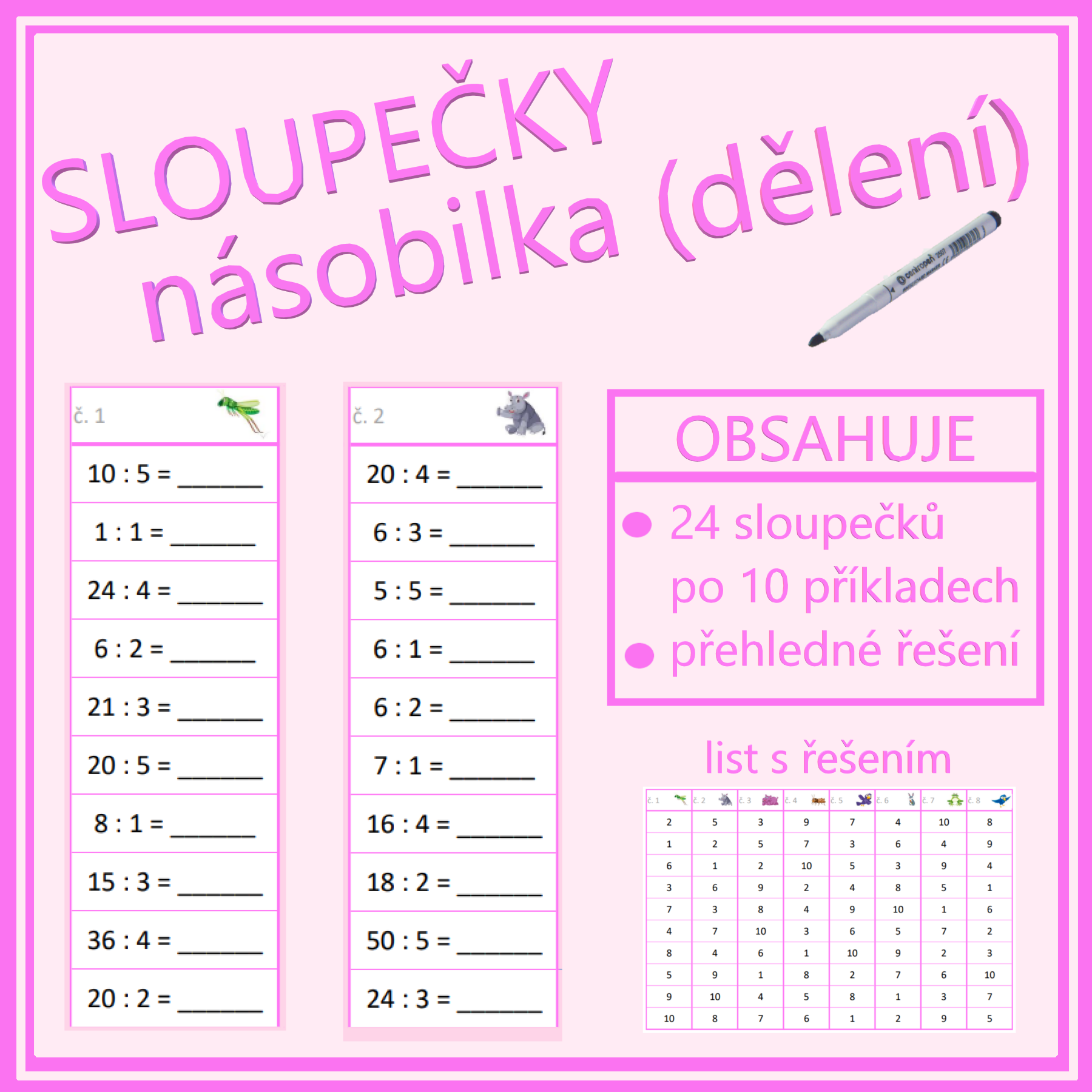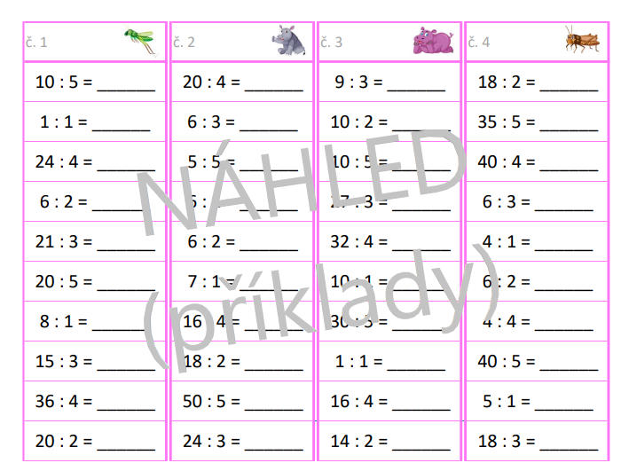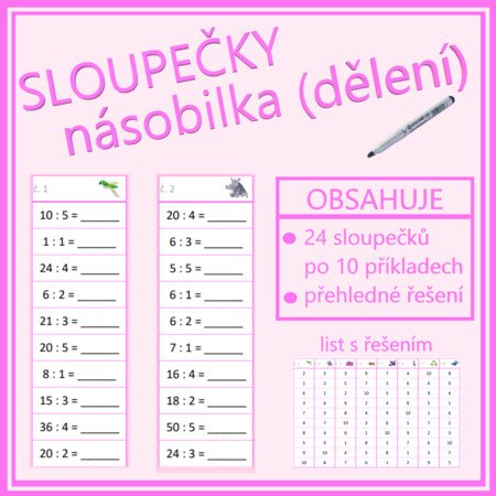 Jednoduchá aktivita na rychlé a efektivní procvičení dělení v rámci násobilky 1-10. Materiál má několik možností využití, lze vytisknout jako pracovní listy, případně vytisknout, zalaminovat a používat jako jednotlivé sloupečky s mazacím fixem. Obsahuje 24 sloupečků, v každém je 10 příkladů, celkem tedy 240 příkladů. Včetně přehledného řešení ve formě tabulky pro jednoduchou kontrolu.