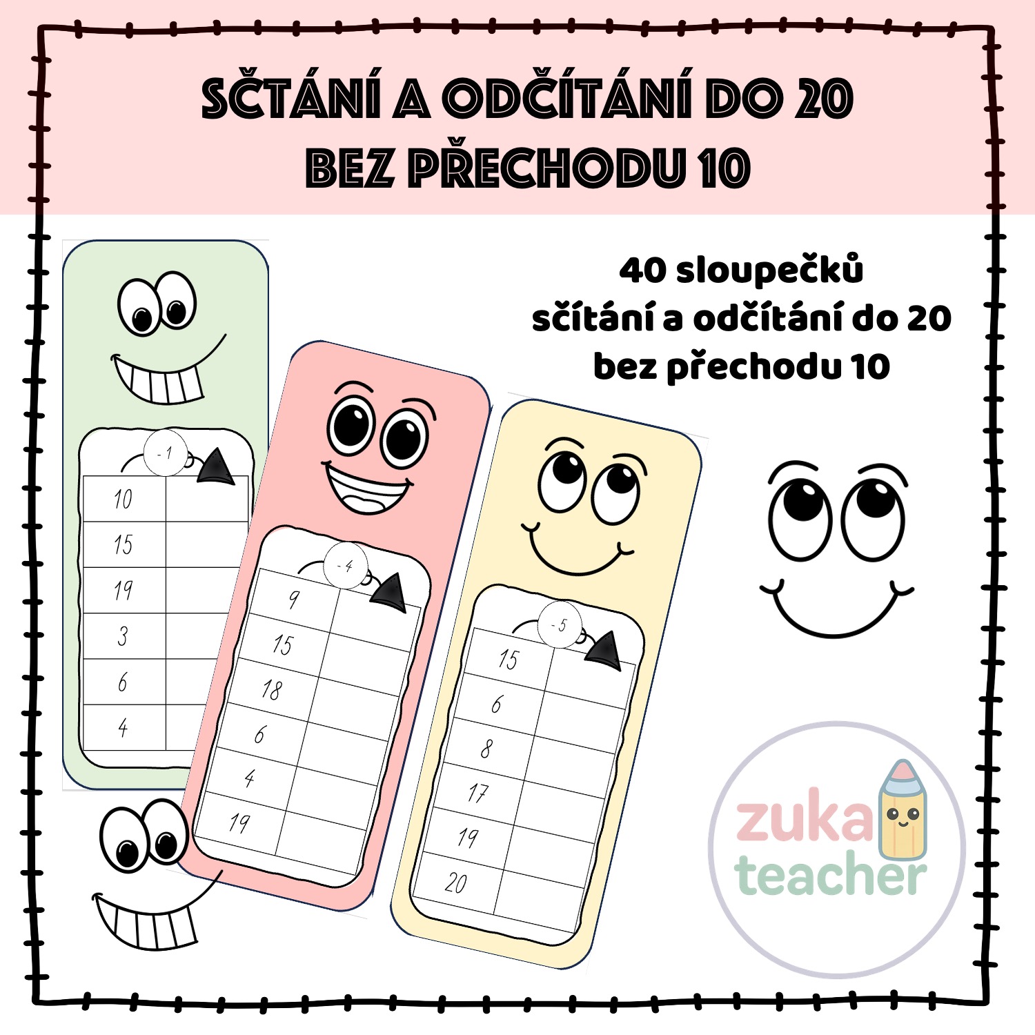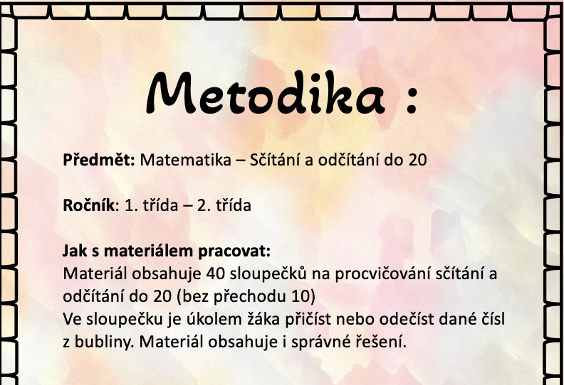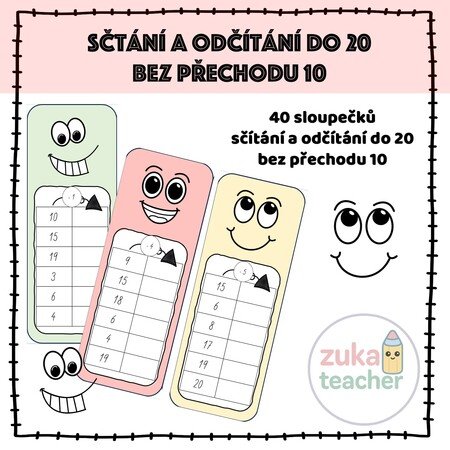 Materiál obsahuje 40 sloupečků na procvičování sčítání a odčítání do 20 (bez přechodu 10)