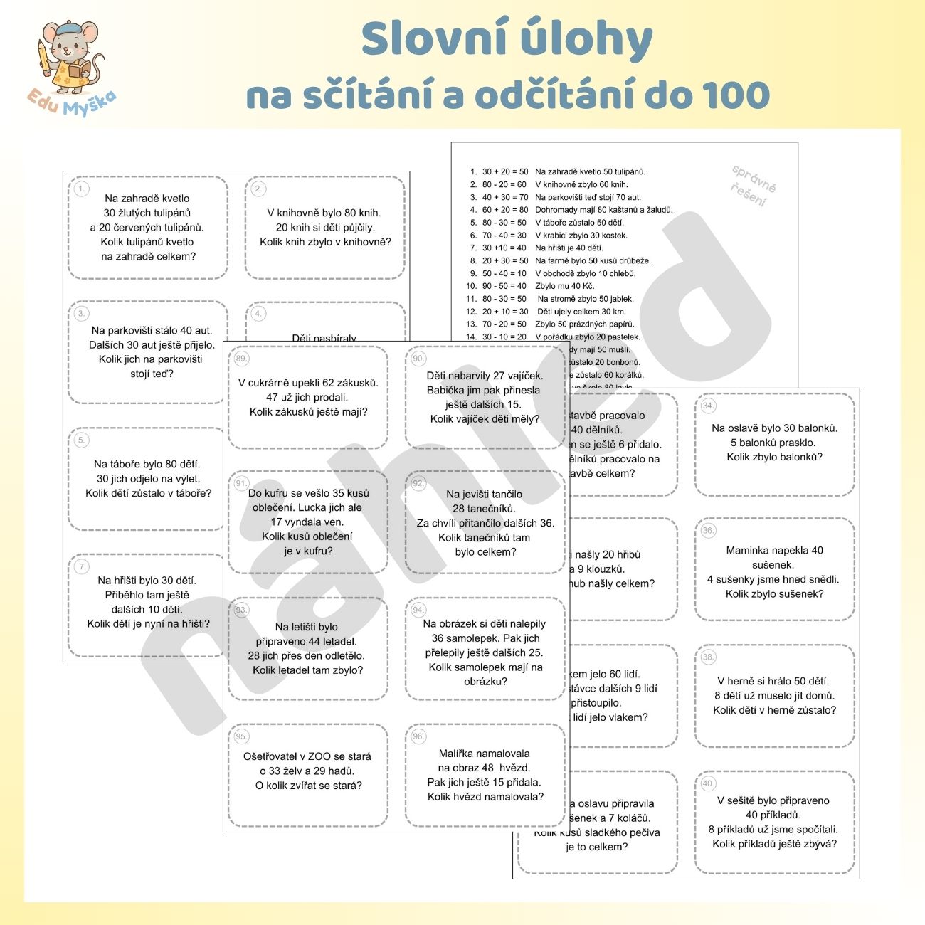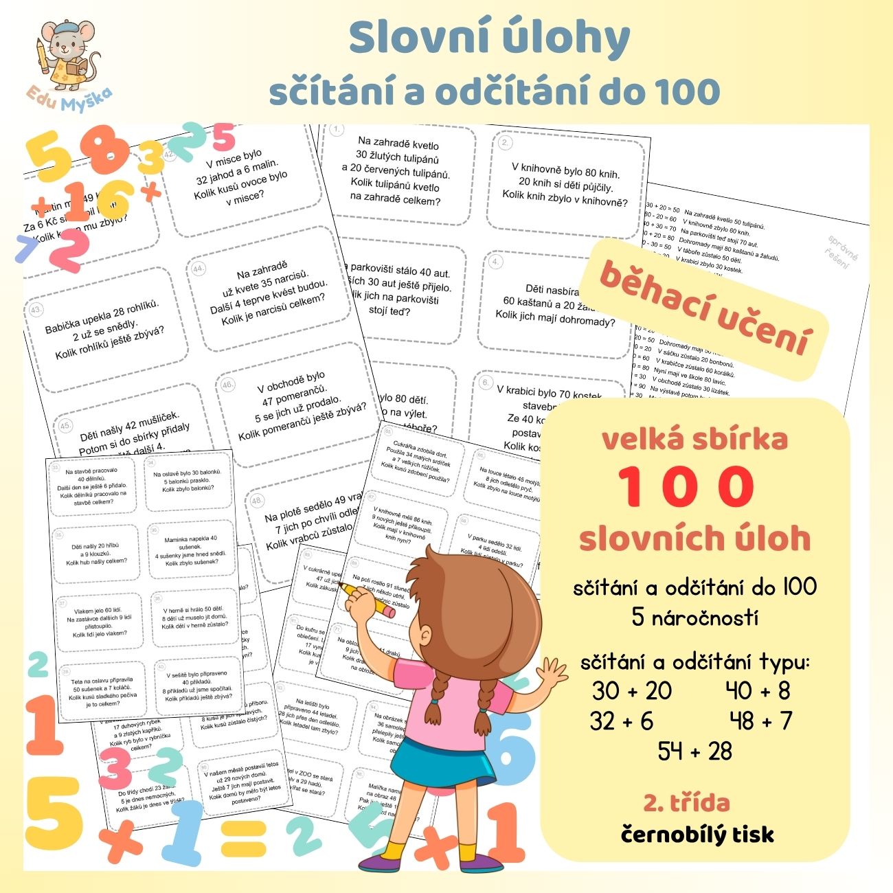Tento soubor obsahuje 100 kartiček se slovními úlohami na sčítání a odčítání do 100.