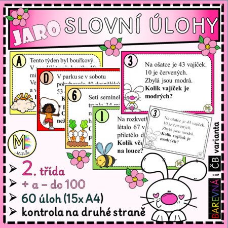 Soubor obsahuje 60 jarních slovních úloh pro matematiku ve 2. třídě, které slouží k procvičování sčítání a odčítání v oboru do 100. Úlohy jsou zasazeny do témat blízkých dětem a reflektují jarní období a situace z každodenního života.