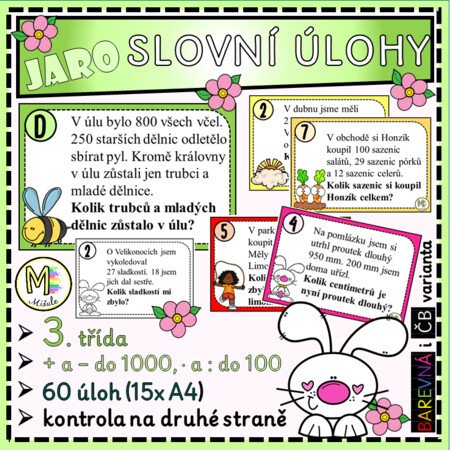 Soubor obsahuje 60 jarních slovních úloh pro matematiku ve 3. třídě, které slouží k procvičování sčítání a odčítání v oboru do 1000, NÁSOBENÍ A DĚLENÍ DO 100. Úlohy jsou zasazeny do témat blízkých dětem a reflektují jarní období a situace z každodenního života.