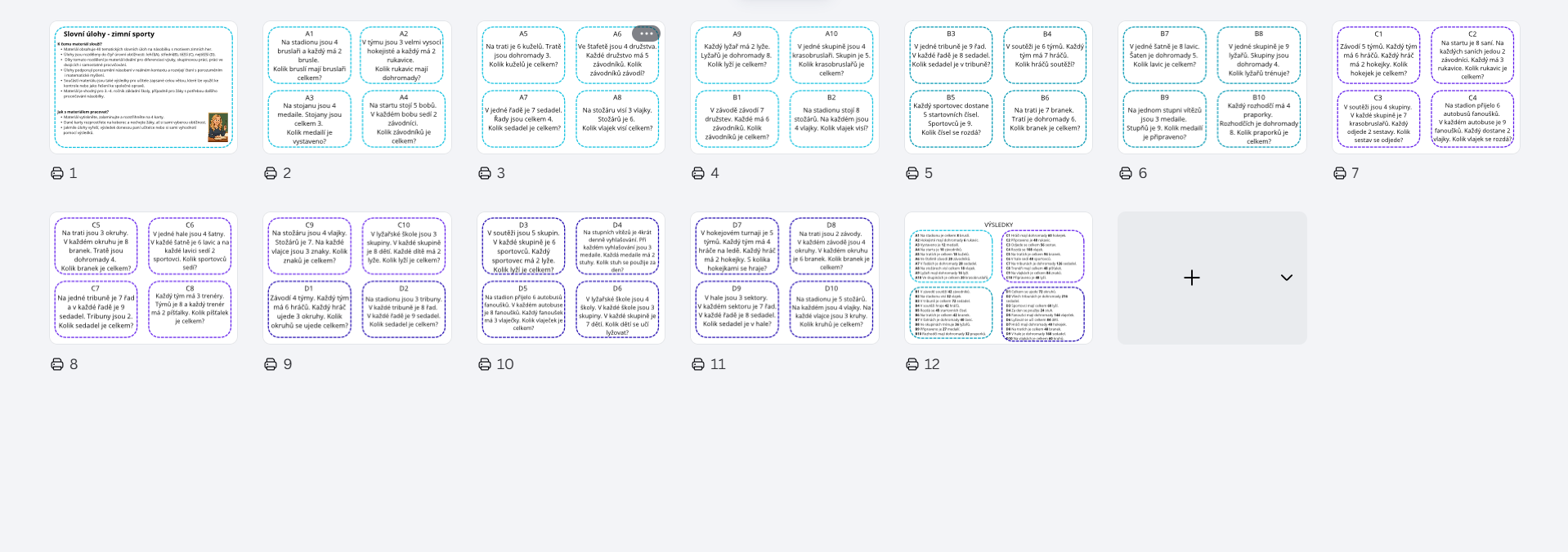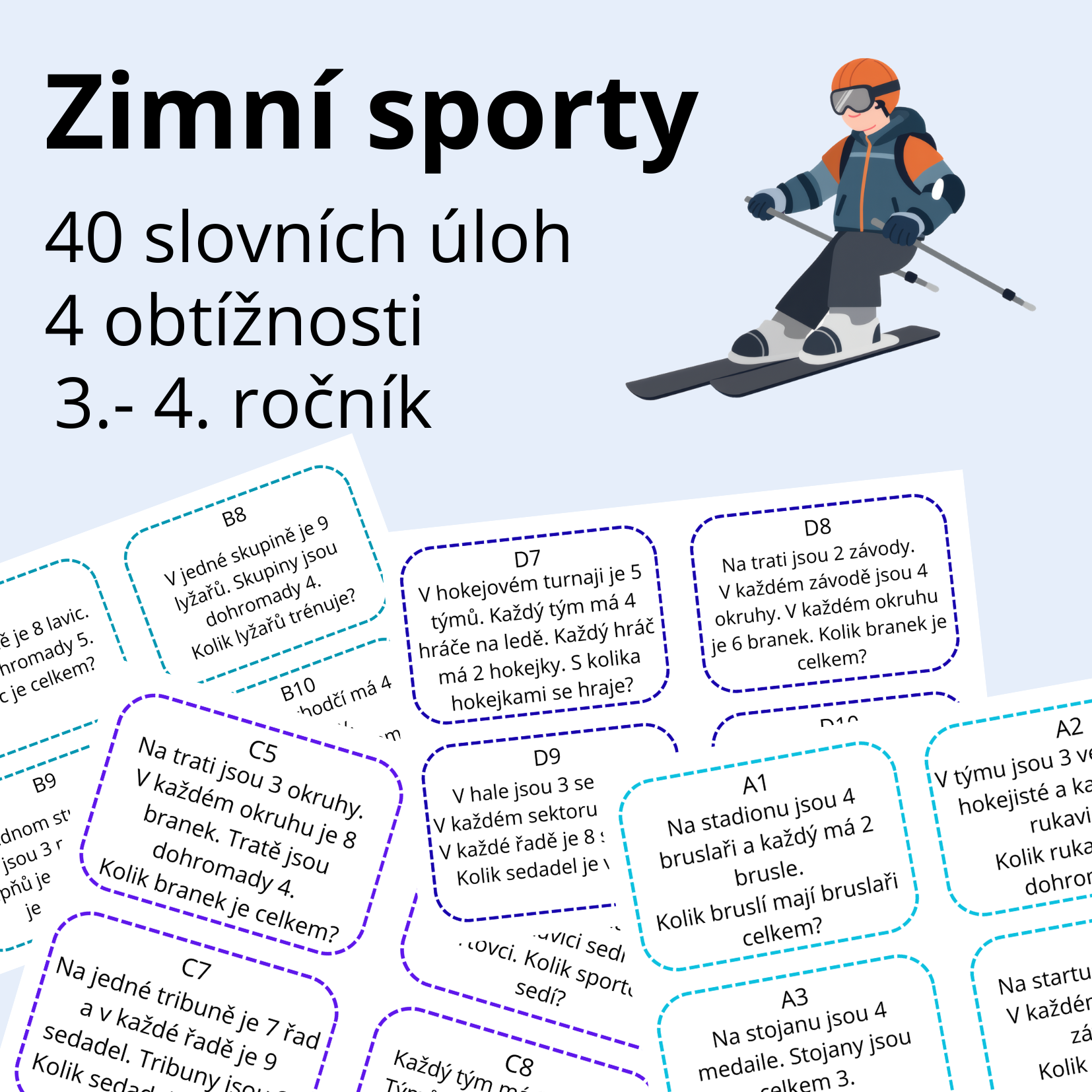 Soubor obsahuje 40 slovních úloh na násobilku s tematikou zimních her, rozdělených do čtyř úrovní obtížnosti.