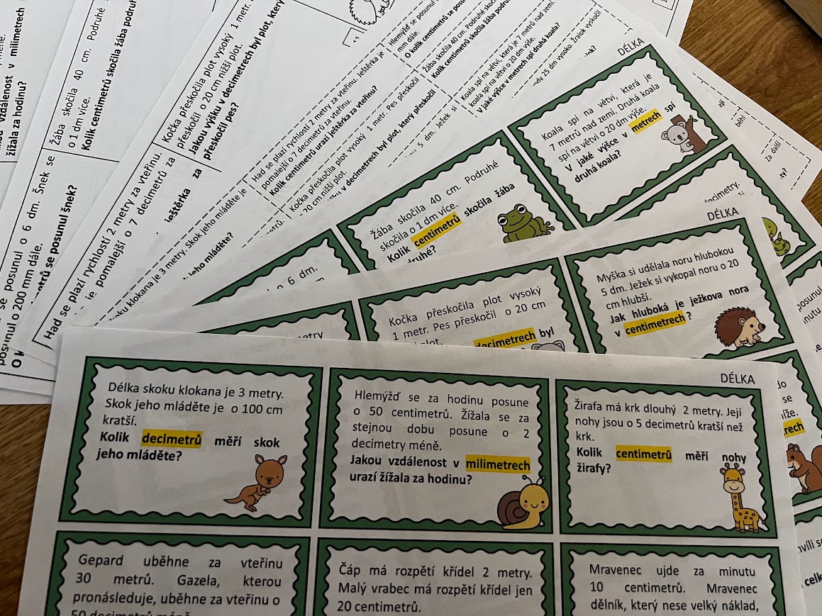 •27 kartiček se slovními úlohami se zvířaty na převody jednotek délky s výsledkem na druhé straně kartičky – barevná verze
