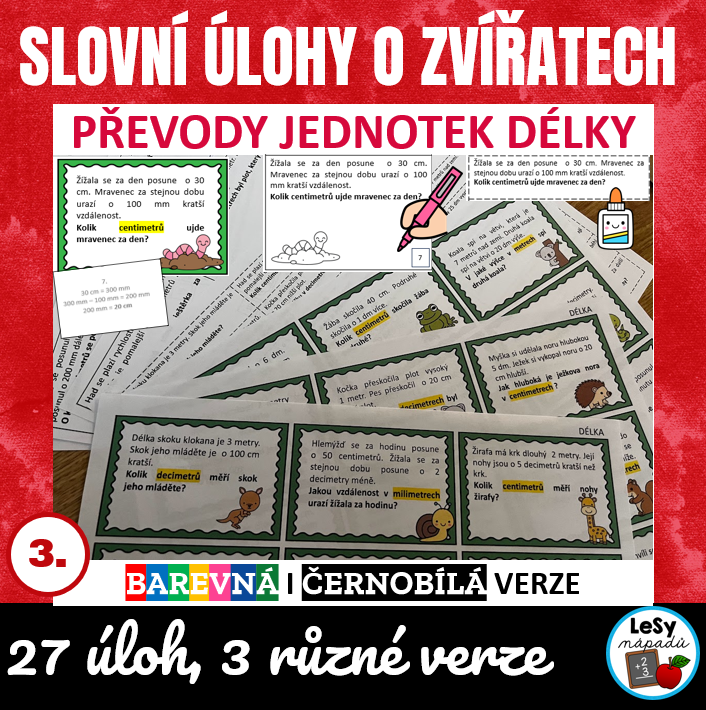 •27 kartiček v tabulce se slovními úlohami se zvířaty na převody jednotek délky – barevná verze, lze použít jako pracovní list