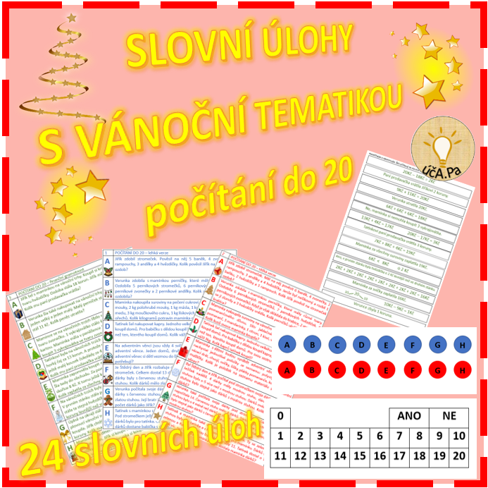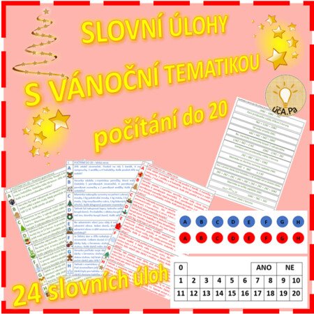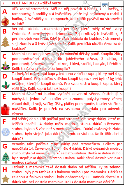 Soubor 24 slovních úloh s vánoční tematikou. Možnost tisku i v černobílé verzi.