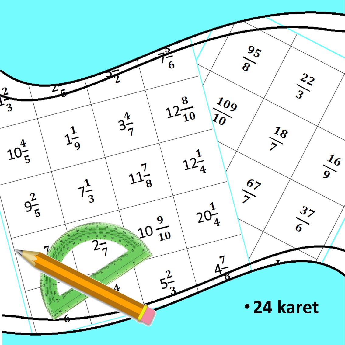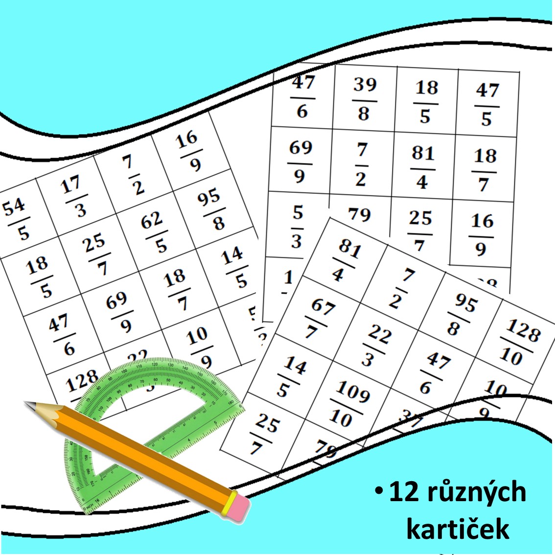 Bingo - mat. obsahuje 12 předpřipravených karet binga s čísly z flash karet. Učitel vylosuje kartu, přečte žákům smíšení číslo, děti na kartičkách hledají odpovídající zlomek. Vyhrává ten, kdo má první řadu 4 čísel vodorovně, svisle nebo uhlopříčně.