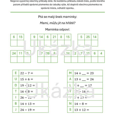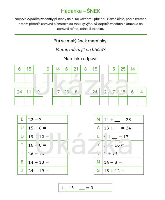 Děti si procvičí sčítání a odčítání, práci s čísly a rozvoj početních strategií prostřednictvím hádanky s tajenkou, kde se správné výpočty promění v odhalení vtipu. Součástí materiálu je také pomůcka k rozkládání čísel, která dětem pomáhá počítat přehledně a s porozuměním. Další části tvoří sčítací pyramida a logické pavučiny. Materiál podporuje samostatné přemýšlení, postupné objevování řešení a je vhodný jak pro individuální práci, tak pro společné učování.