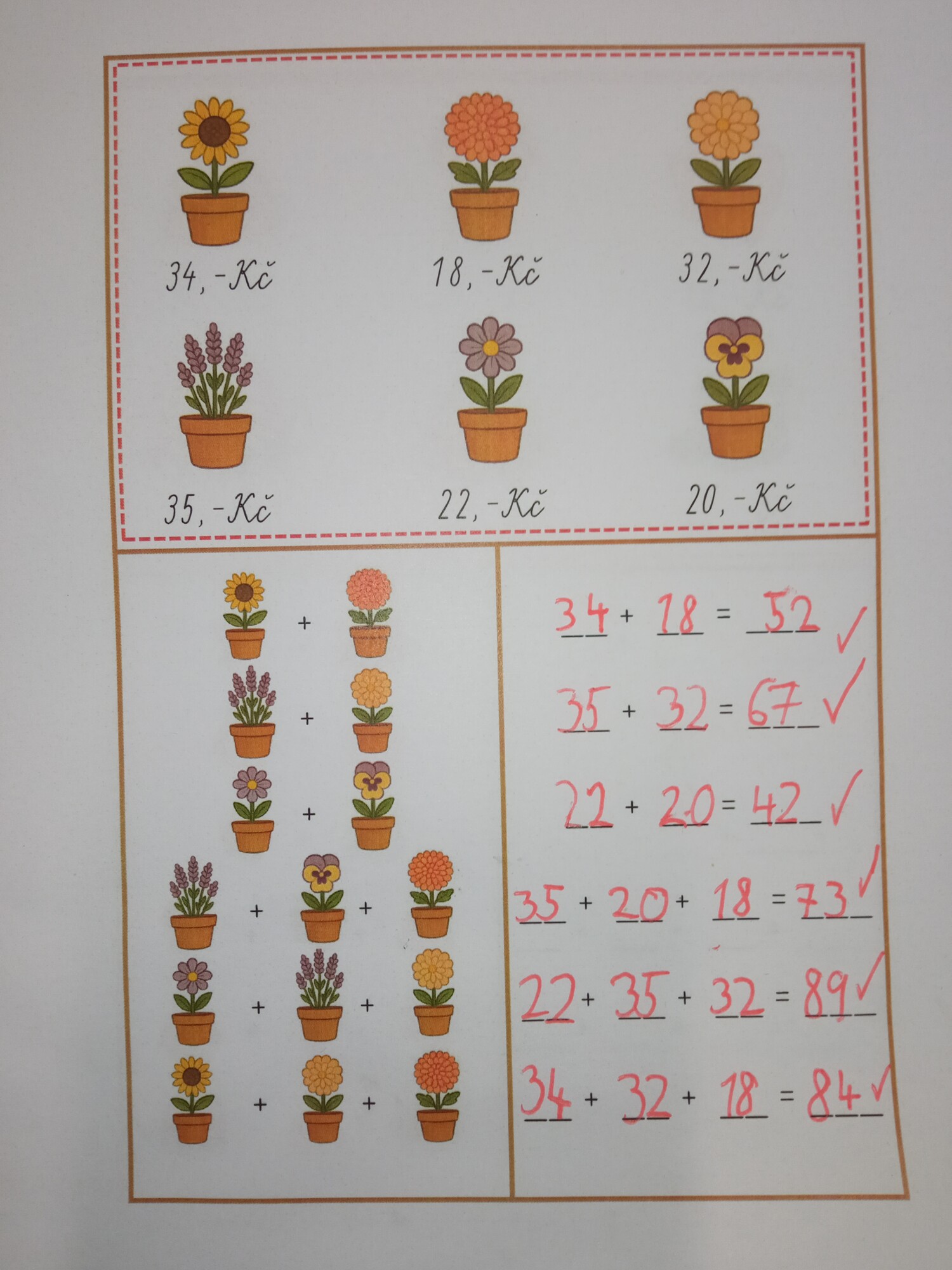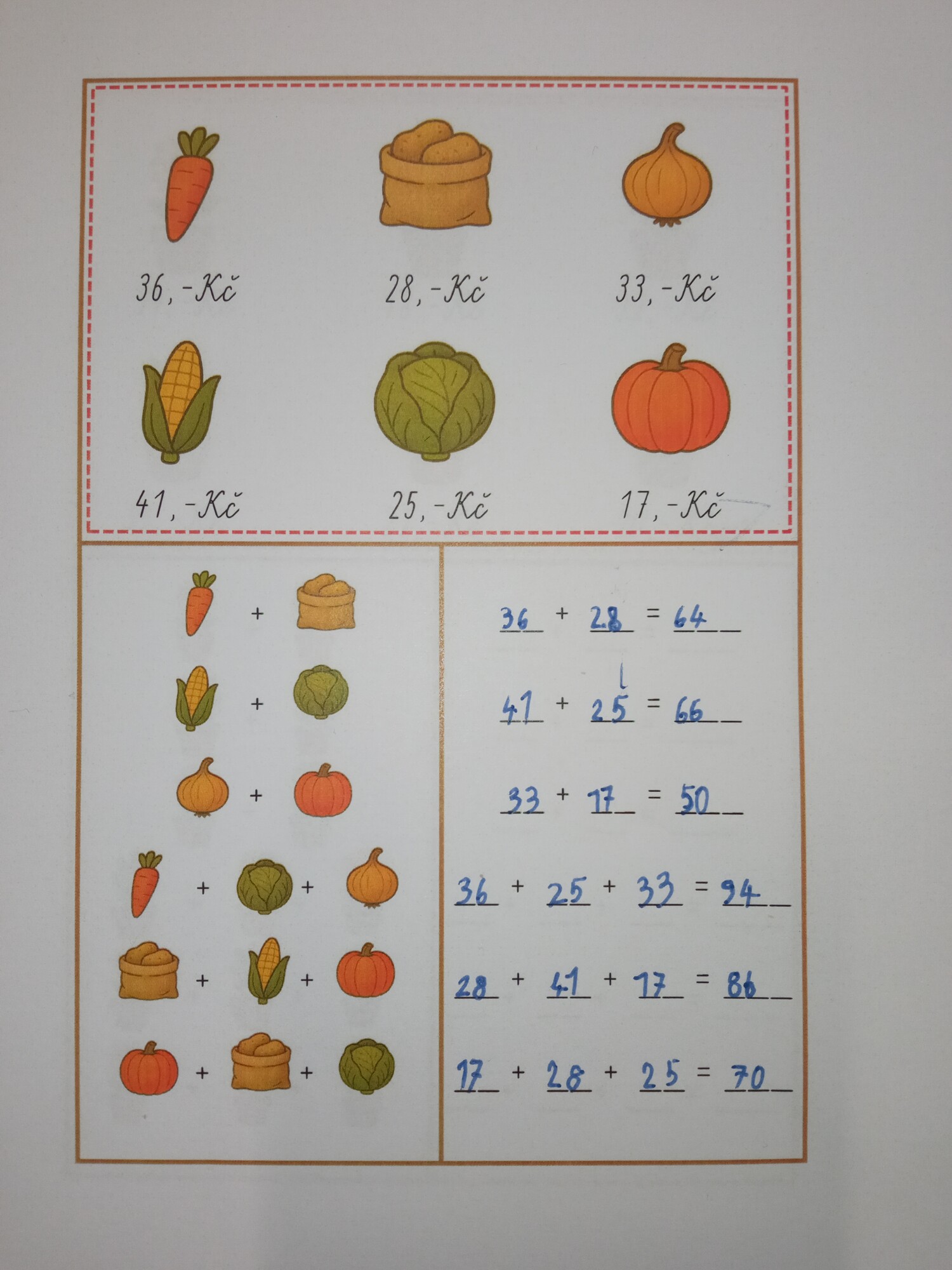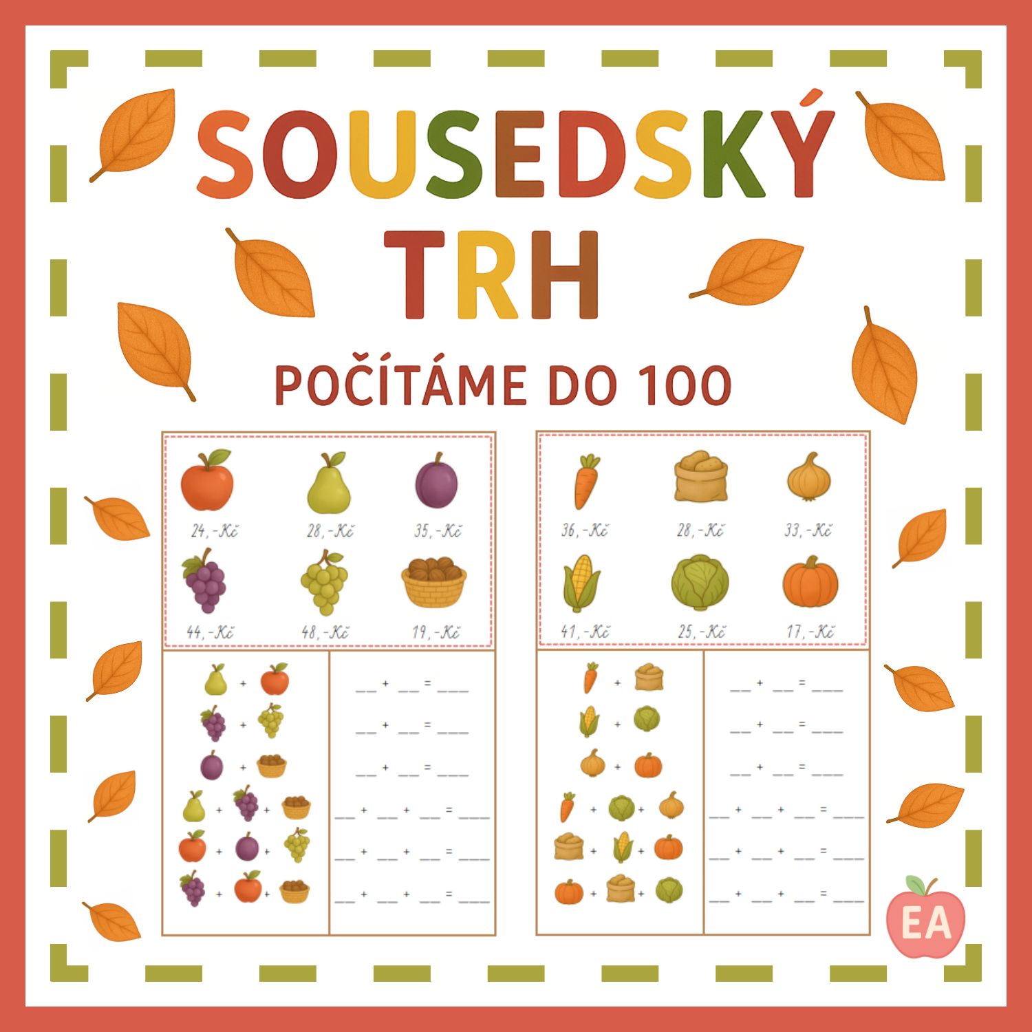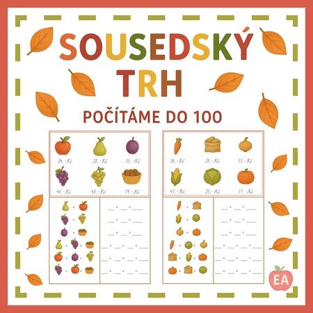 Pomůcka dětem pomáhá procvičit si sčítání v oboru do 100 při nakupování na sousedském trhu. Děti podle nákupního seznamu s obrázky vyhledávají odpovídající ceny, zapisují je do příkladů a počítají, kolik mají zaplatit.