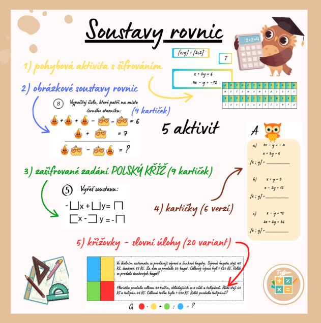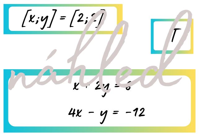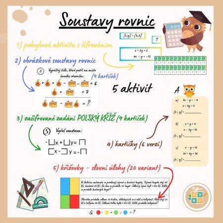 - na každé kartičce jsou 2 slovní úlohy, které je potřeba vyřešit využitím soustavy dvou rovnic o dvou neznámých