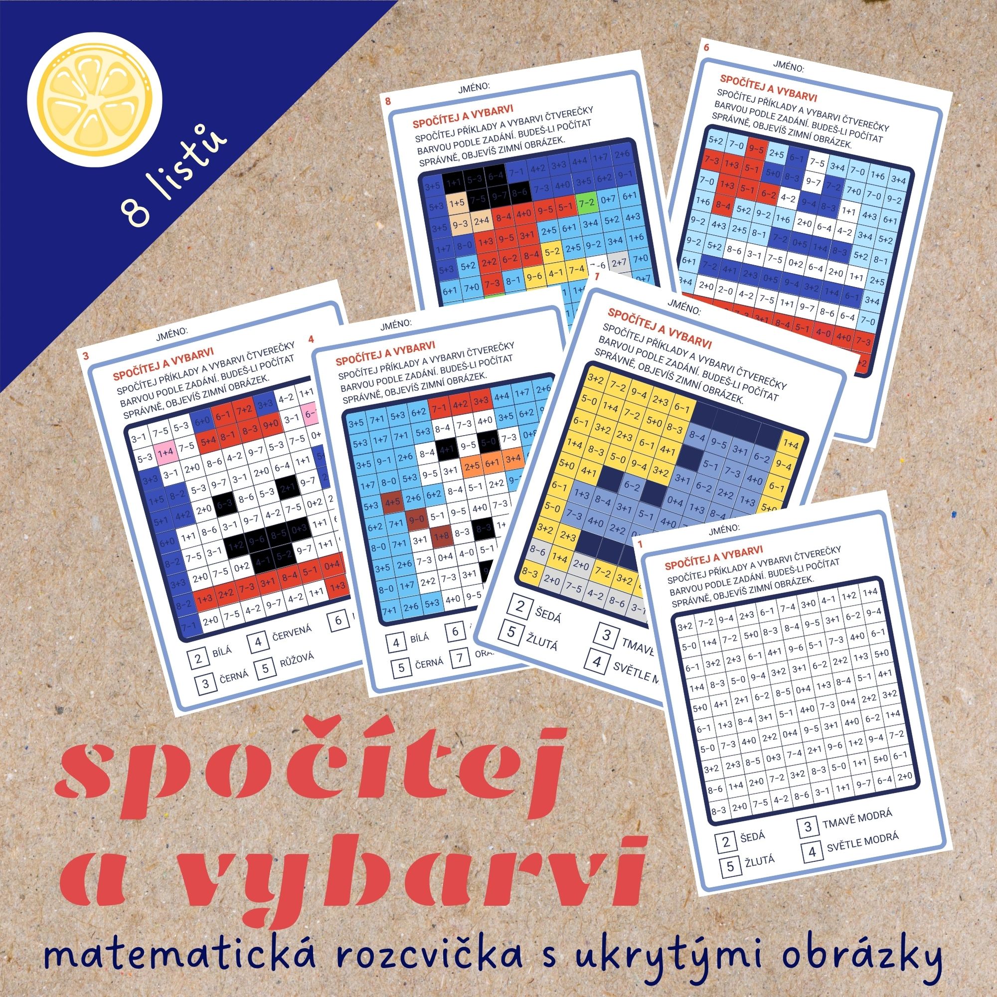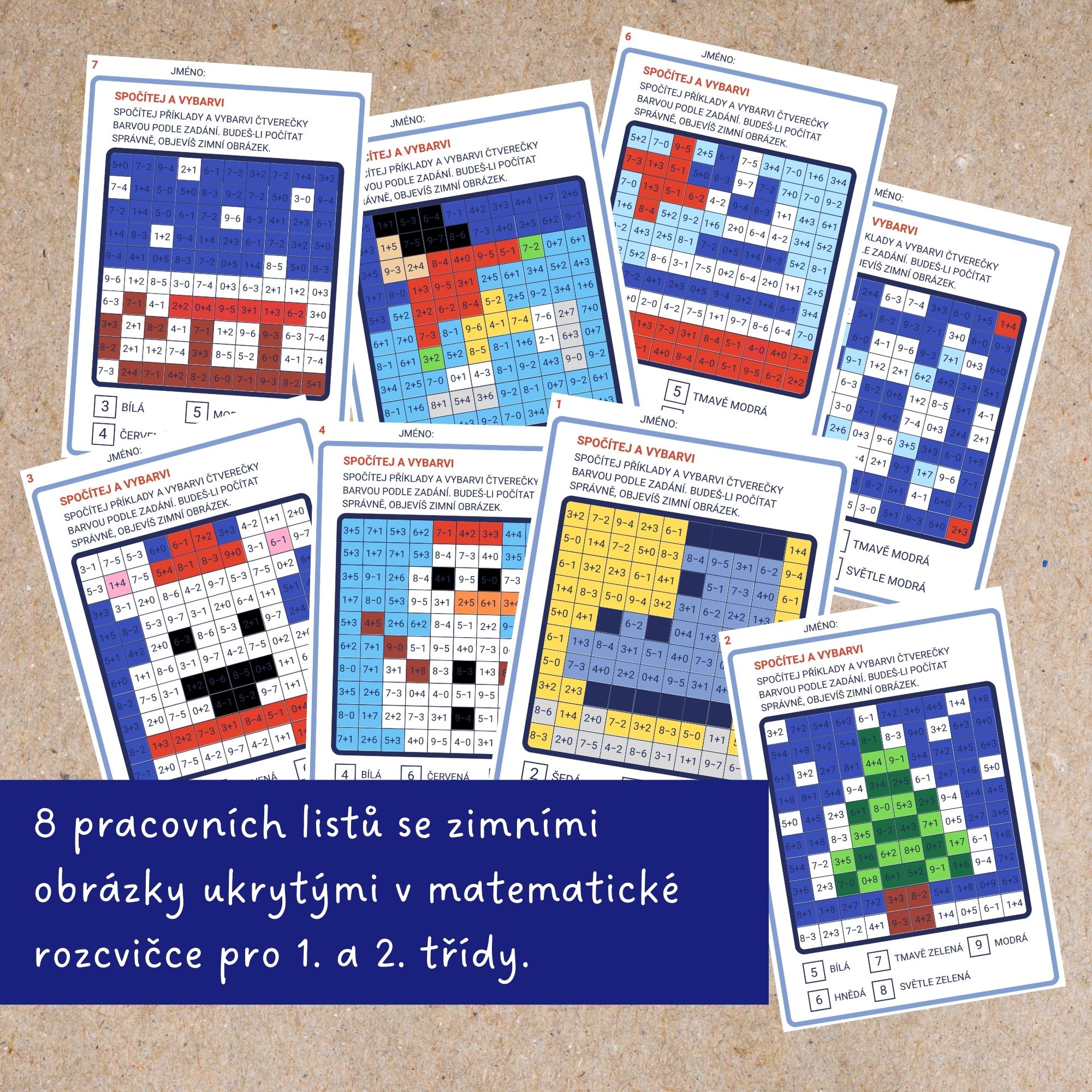 ⛄Sada osmi pracovních listů s příklady, kde se po vypočítání a vybarvení za odměnu odkryje obrázek s tematickou zimy a zimních sportů ⛸️. Aktivita zpestří zimní hodiny matematiky v 1. a 2. třídě a děti si při ní nejspíš ani nevšimnou, že vlastně procvičují sčítání a odčítání od 1 do 10.