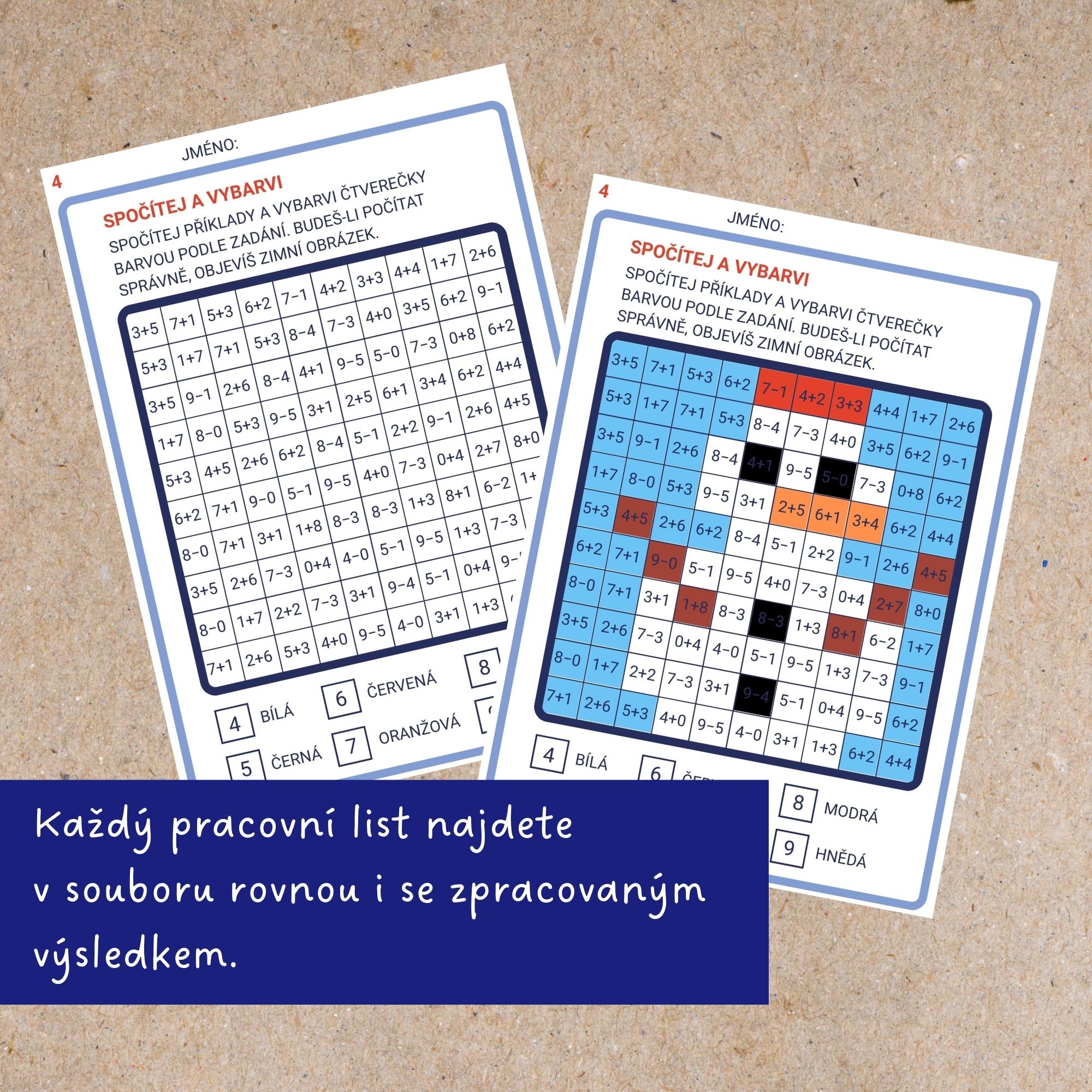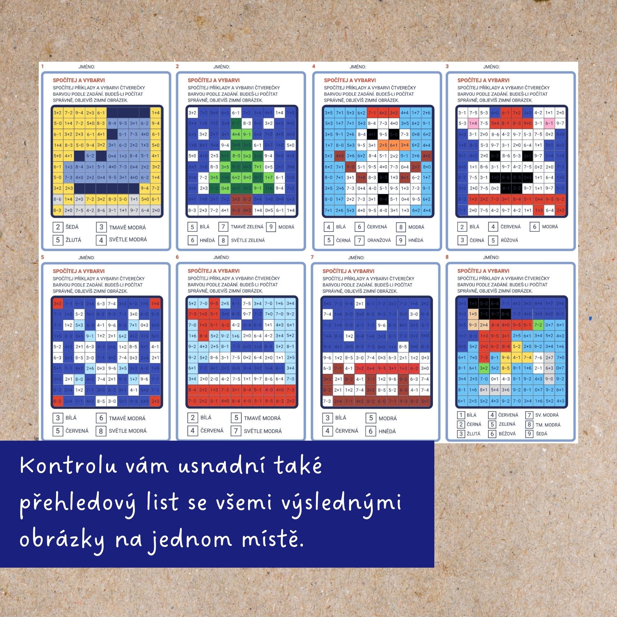 ⛄V souboru najdete 8 pracovních listů a k nim rovnou již zpracované listy s výslednými obrázky, abyste se s vybarvováním nemuseli trápit sami 🙂 Díky nim snadno zkontrolujete, zda mají děti na svých pracovních listech správně všechny detaily.
