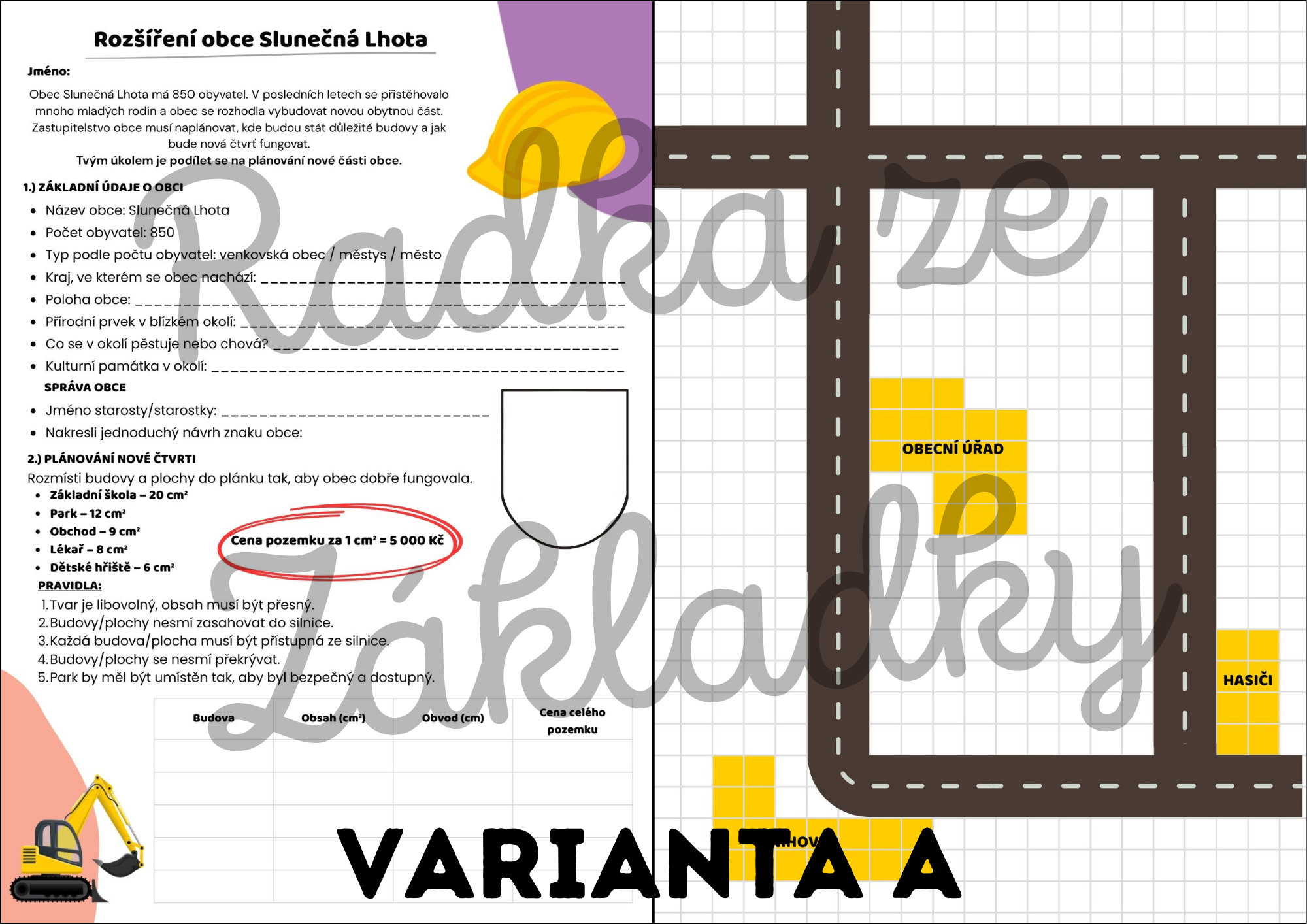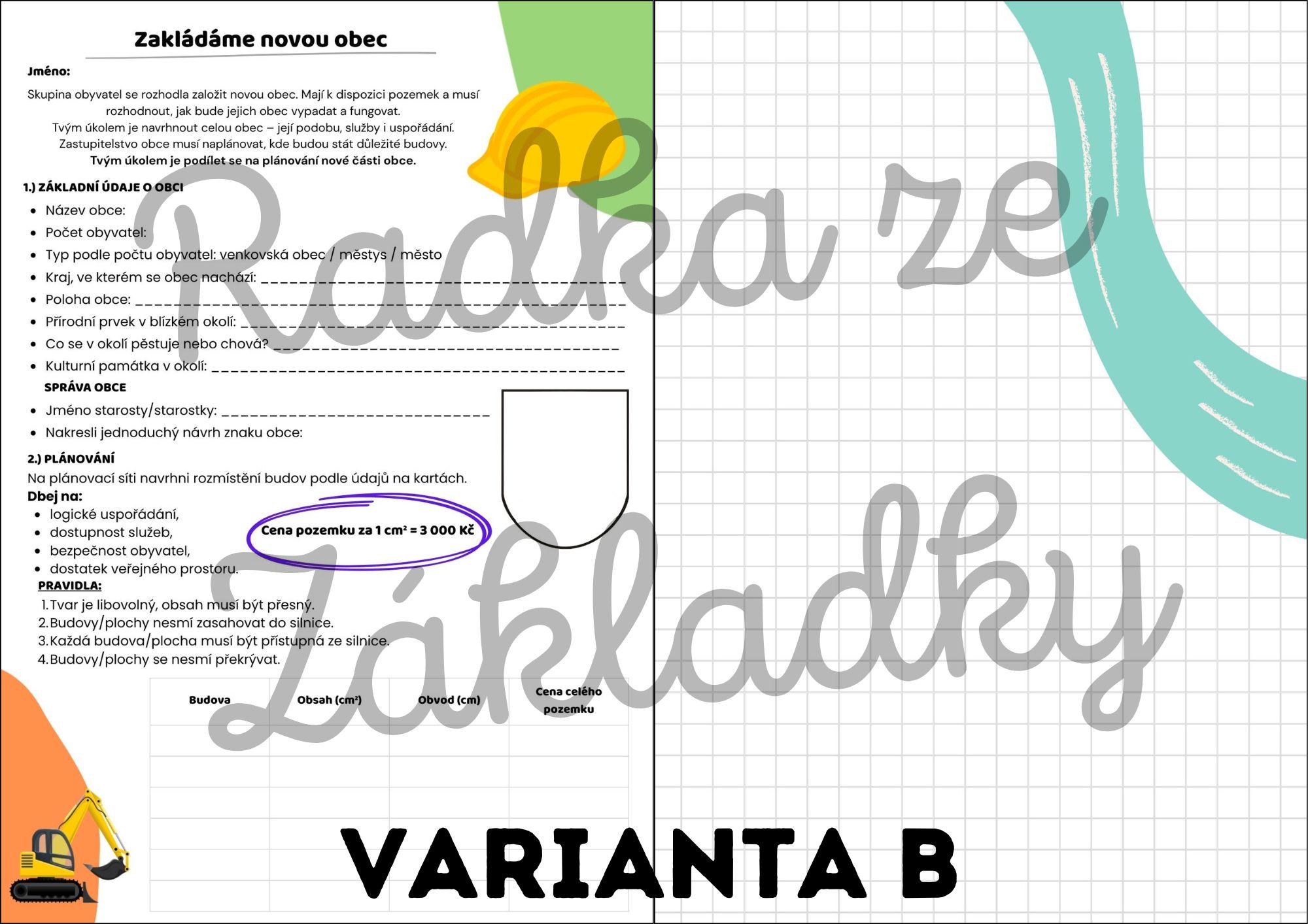 Žáci navrhují novou obec od začátku. Losují 3 povinné budovy (z 3 kategorií), umístí je do vybraného plánku a musí splnit zadané podmínky. Poté mohou obec kreativně doplnit dalšími stavbami, počítají obsah, obvod i ceny. Volitelně lze zařadit rozpočet a finanční gramotnost.