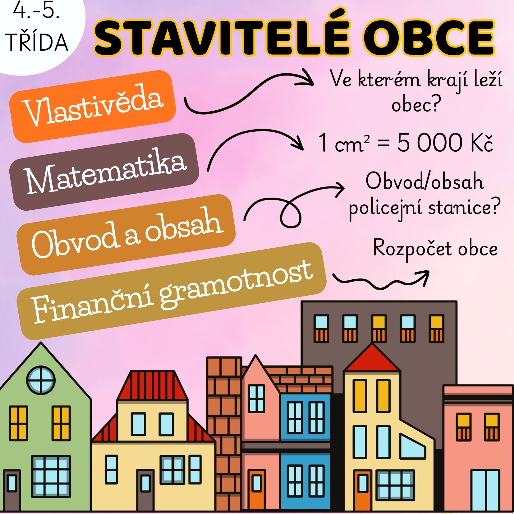 „Stavitelé obce“ je materiál pro 4.–5. ročník ZŠ, který propojuje matematiku, vlastivědu a finanční gramotnost. Žáci se ocitají v roli zastupitelstva a plánují rozvoj nebo vznik nové obce. Pracují ve čtvercové síti, počítají obsah a obvod, stanovují cenu pozemků a hospodaří s omezeným rozpočtem.