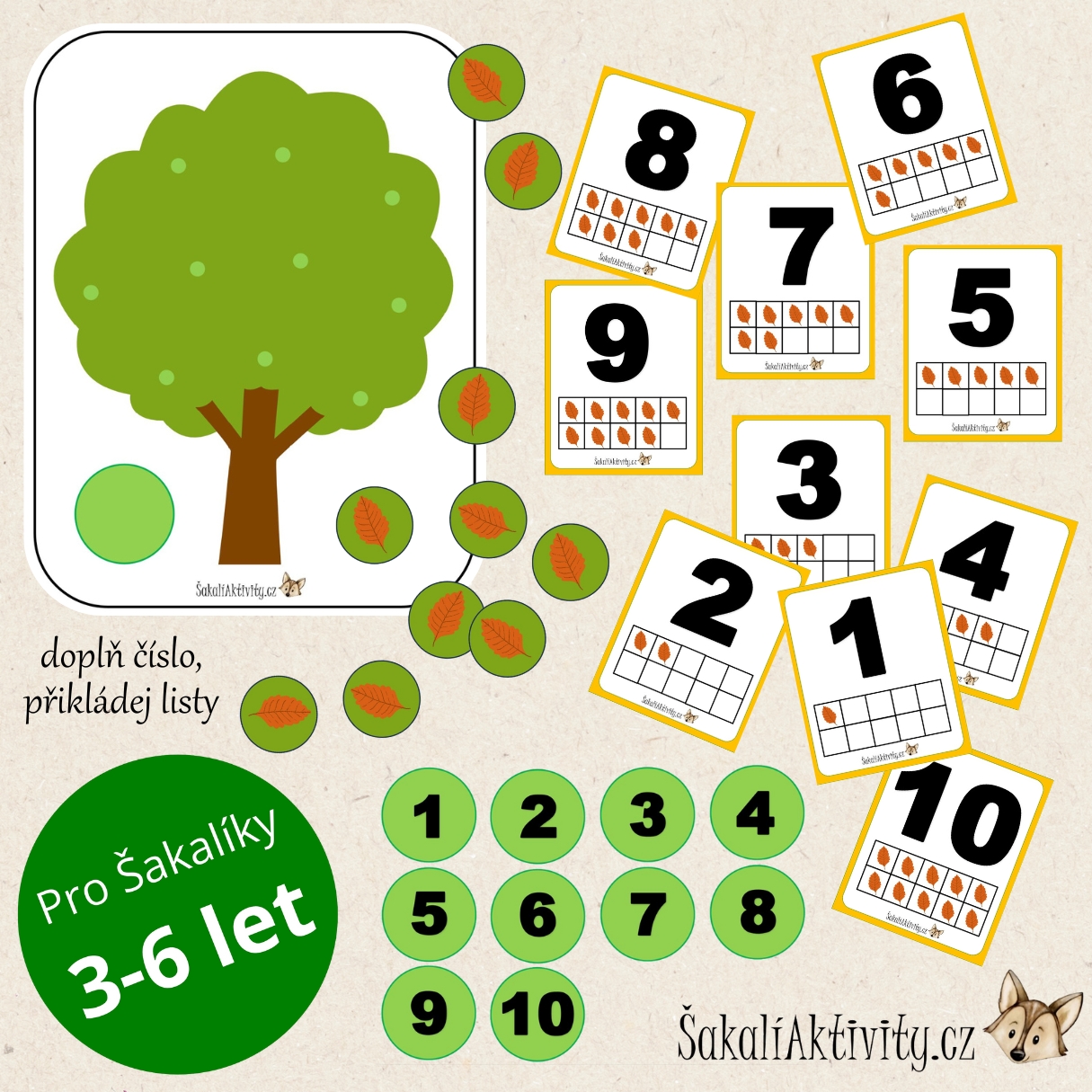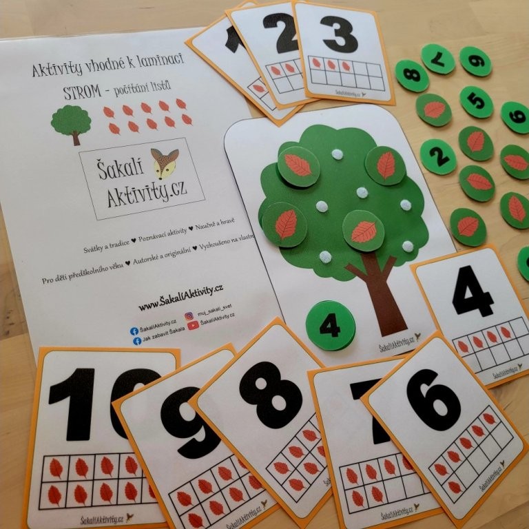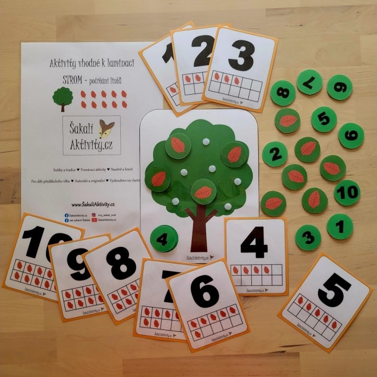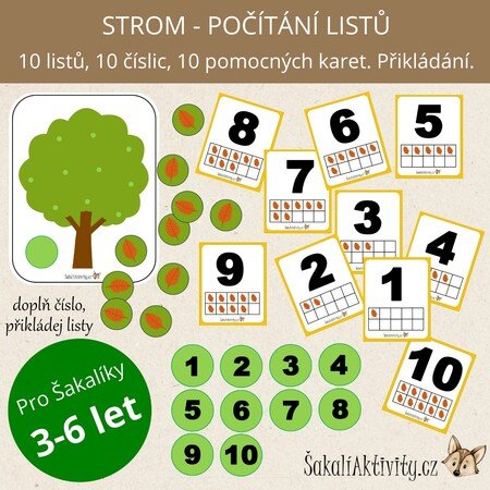 Strom – počítání listů je originální PDF aktivita, která propojuje matematiku s přírodním motivem. Děti si při ní zábavnou formou upevňují představu o číslech a množství. Soubor obsahuje obrázek stromu, číslovky, listy k doplnění a předlohové karty, na nichž je vždy číslice znázorněna spolu s odpovídajícím počtem listů.