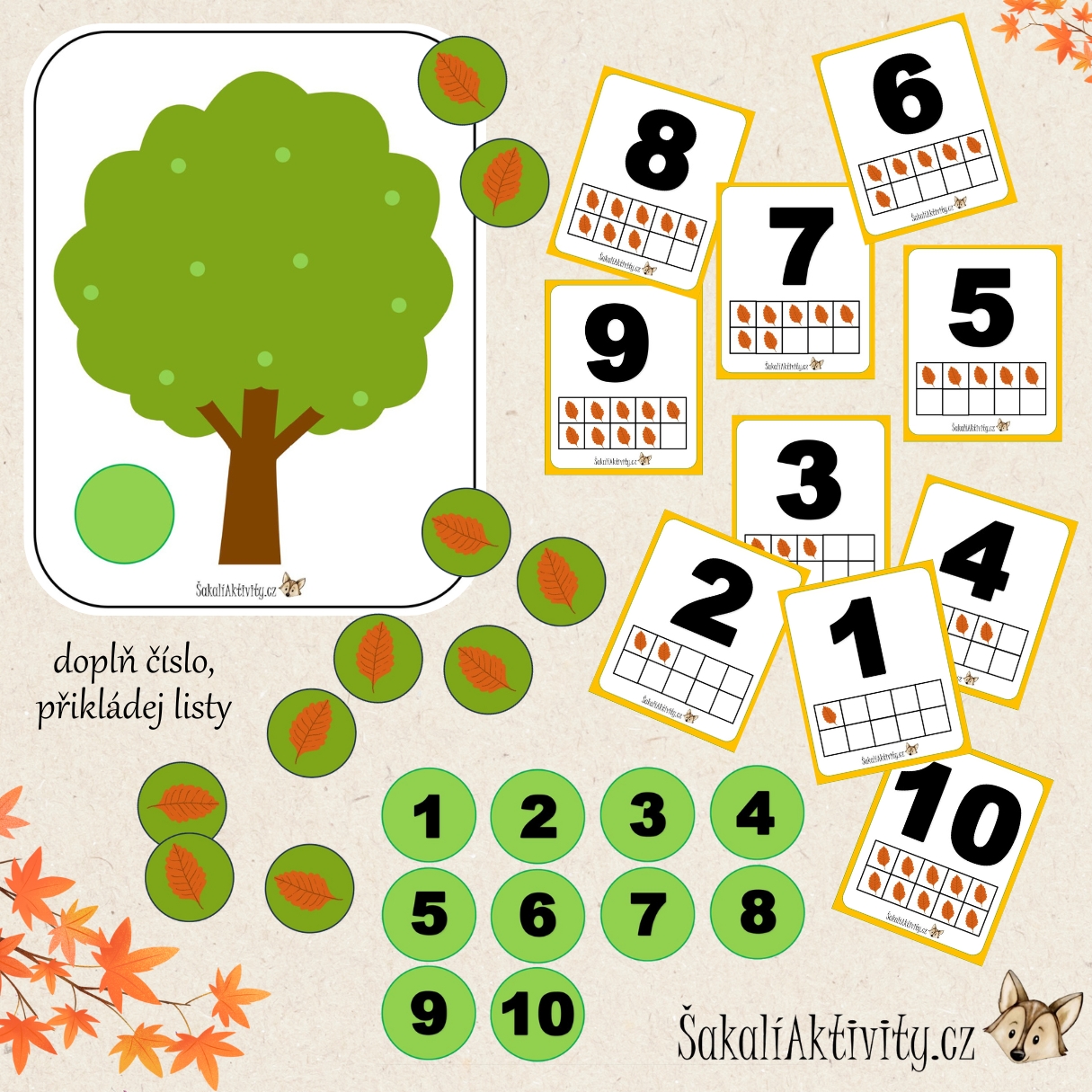Soubor obsahuje strom s 10 listy k vystřižení a předlohové karty s číslicemi 1–10. Vše je připraveno v PDF formátu k tisku a okamžitému použití.