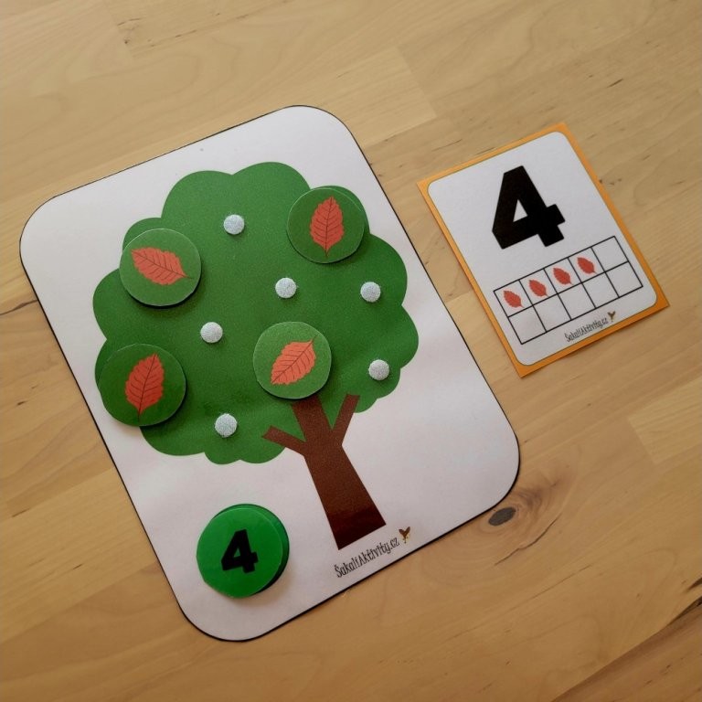 Úkolem dítěte je vybrat správnou číslici a umístit ji ke stromu. Poté přidá tolik listů, kolik číslice označuje. Pokud si není jisté, využije pomocnou kartu s vizuálním znázorněním počtu. Díky propojení symbolu (číslice), konkrétního množství (listy) a grafické předlohy (karta) se děti učí chápat čísla v souvislostech.