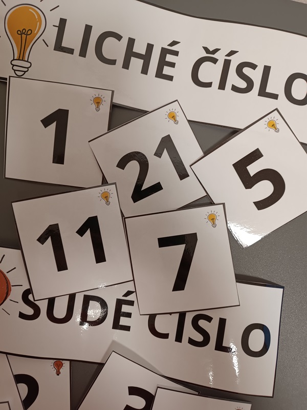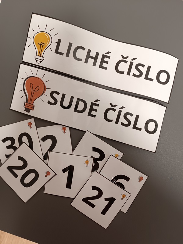 První materiál tvoří karty s názvy Sudá, Lichá a kartičky s čísly 1 - 30. Karty jsou označeny žárovkou v červené a žluté barvě pro vysvětlení sudých a lichých čísel, přiřazování.