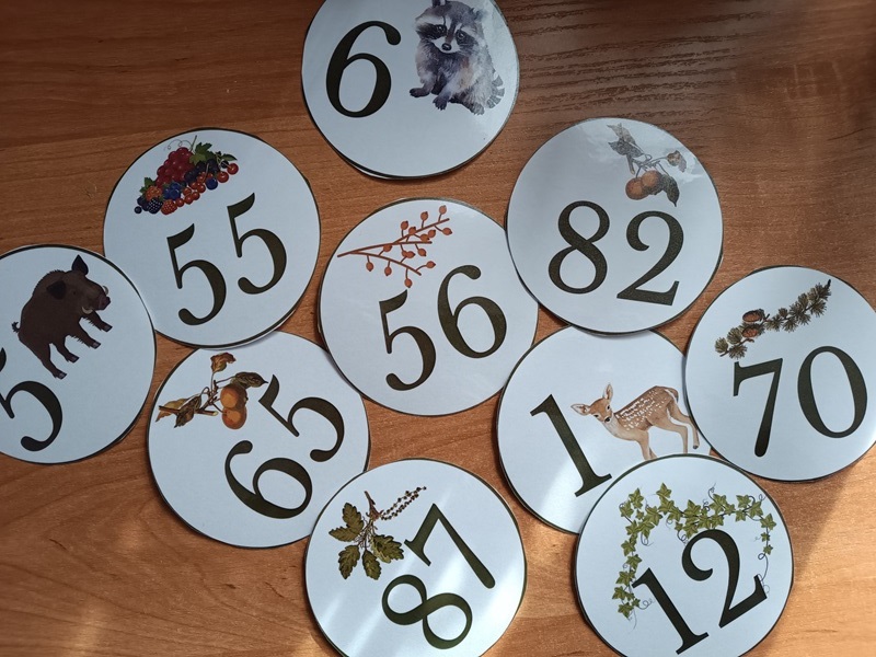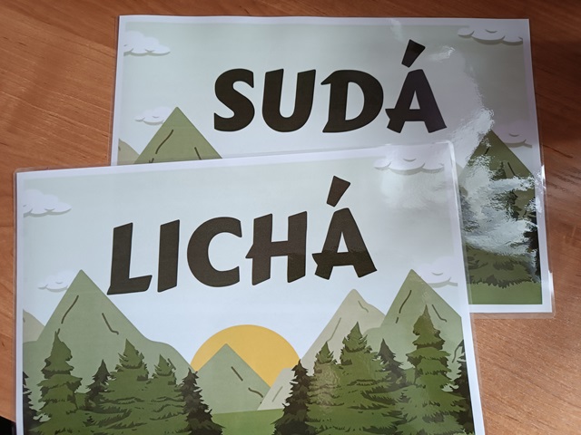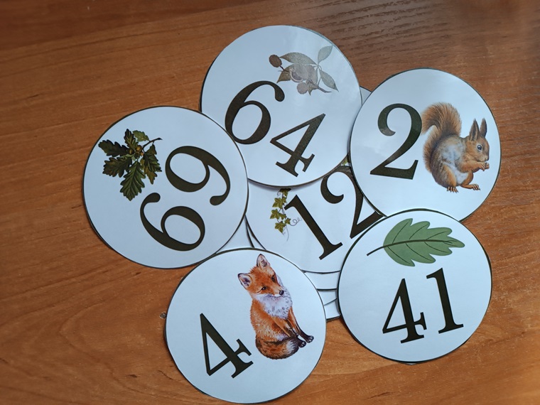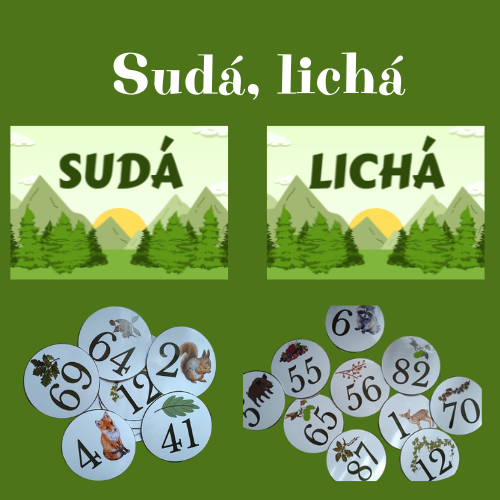 Druhý materiál obsahuje kartičky s čísly 0 – 100 v tématu les. Žáci kartičky (kruhový tvar) třídí ke kartám velikosti A4 s nápisem SUDÁ, LICHÁ.